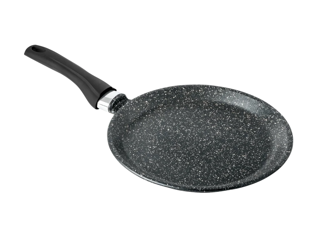 Блинная сковорода с антипригарным покрытием – литая алюминиевая посуда, которая подходит для газовых, электрических, стеклокерамических и индукционных плит. «Гранит Induction». Посуда базовой коллекции «Гранит» с важной особенностью – наличием индукционного дна. Сочетание классического черного цвета с белым крапом призвано подчеркнуть такие качества посуды, как высокопрочность и долговечность, подобно настоящей породе граниту. Литой пищевой алюминий - без канцерогенных веществ. Материал долговечный, не поддается деформации. Толстые стенки и утолщенное дно обеспечивают равномерное распределение тепла. Сковородка с антипригарным покрытием на водной основе без вредных химических соединений экологична. Процесс готовки может протекать без добавления масла. Гладкая поверхность — залог легкого мытья вручную и в посудомоечной машине. Эргономичные ручки сковородок из бакелита не нагреваются, а благодаря покрытию софт-тач не выскальзывают из рук.