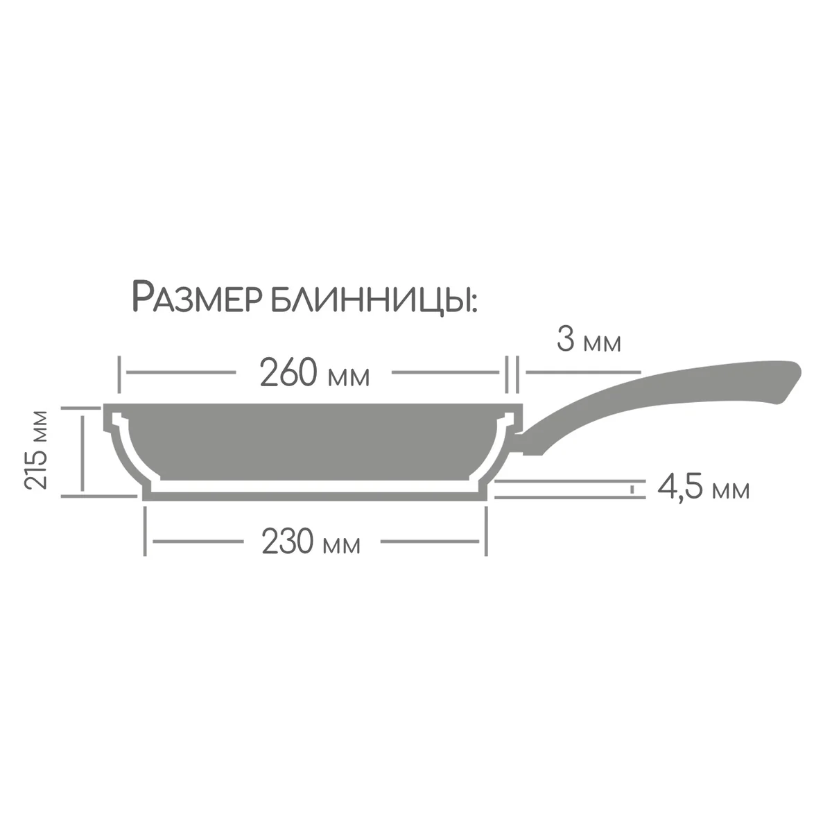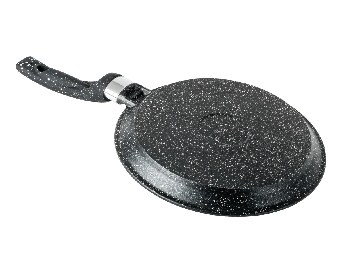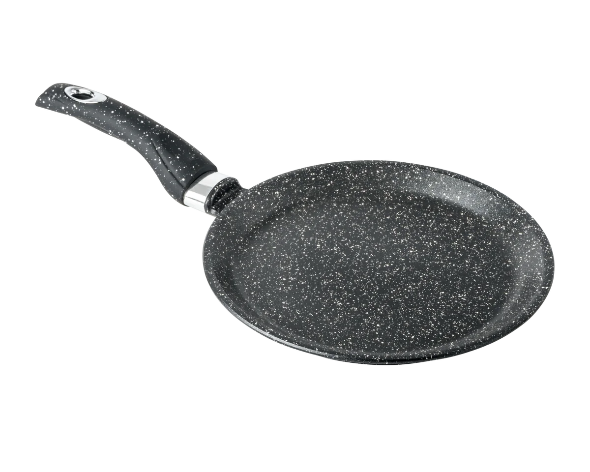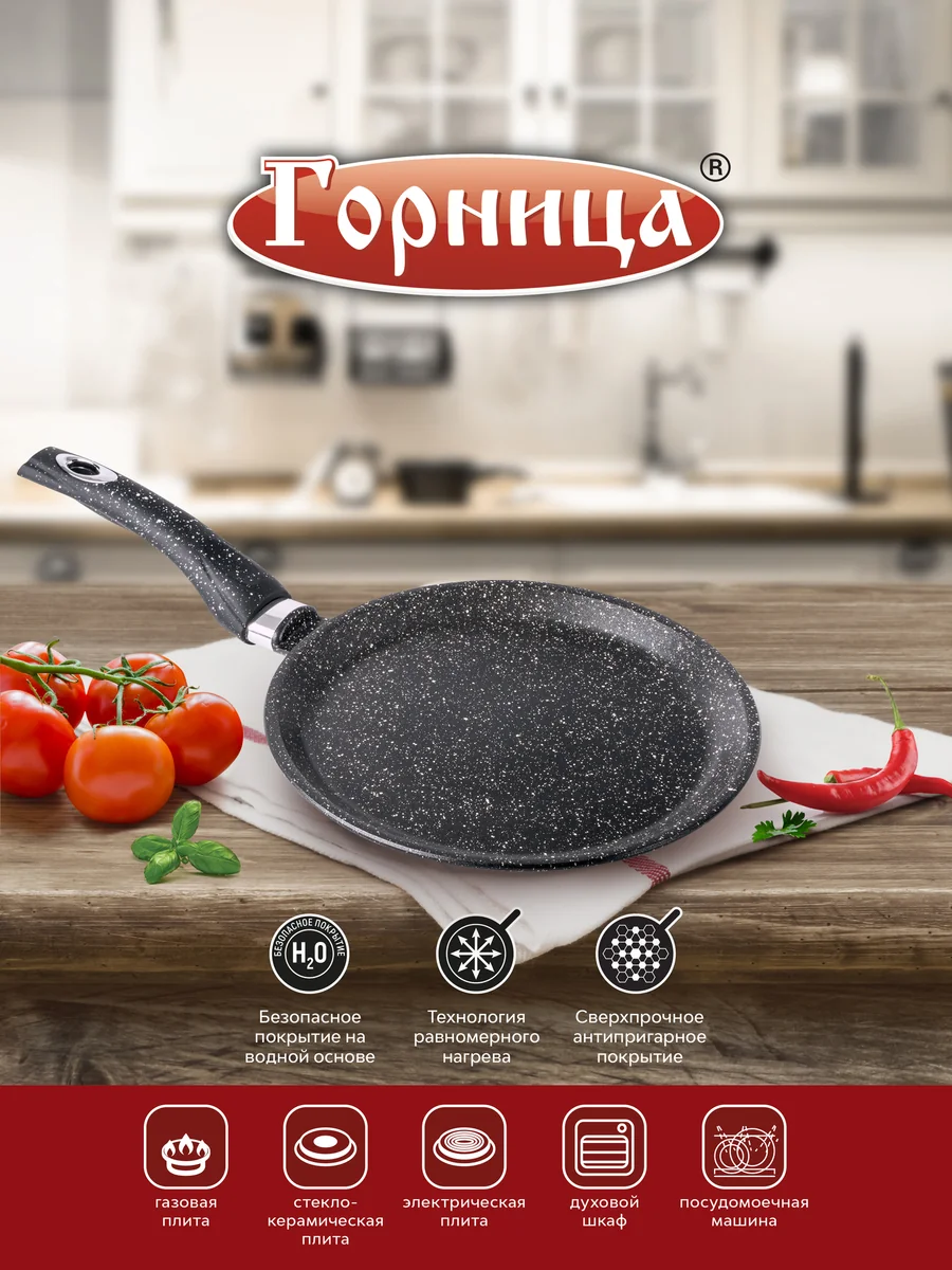 Литая алюминиевая блинная сковорода с антипригарным покрытием подходит для газовых, электрических и стеклокерамических плит.