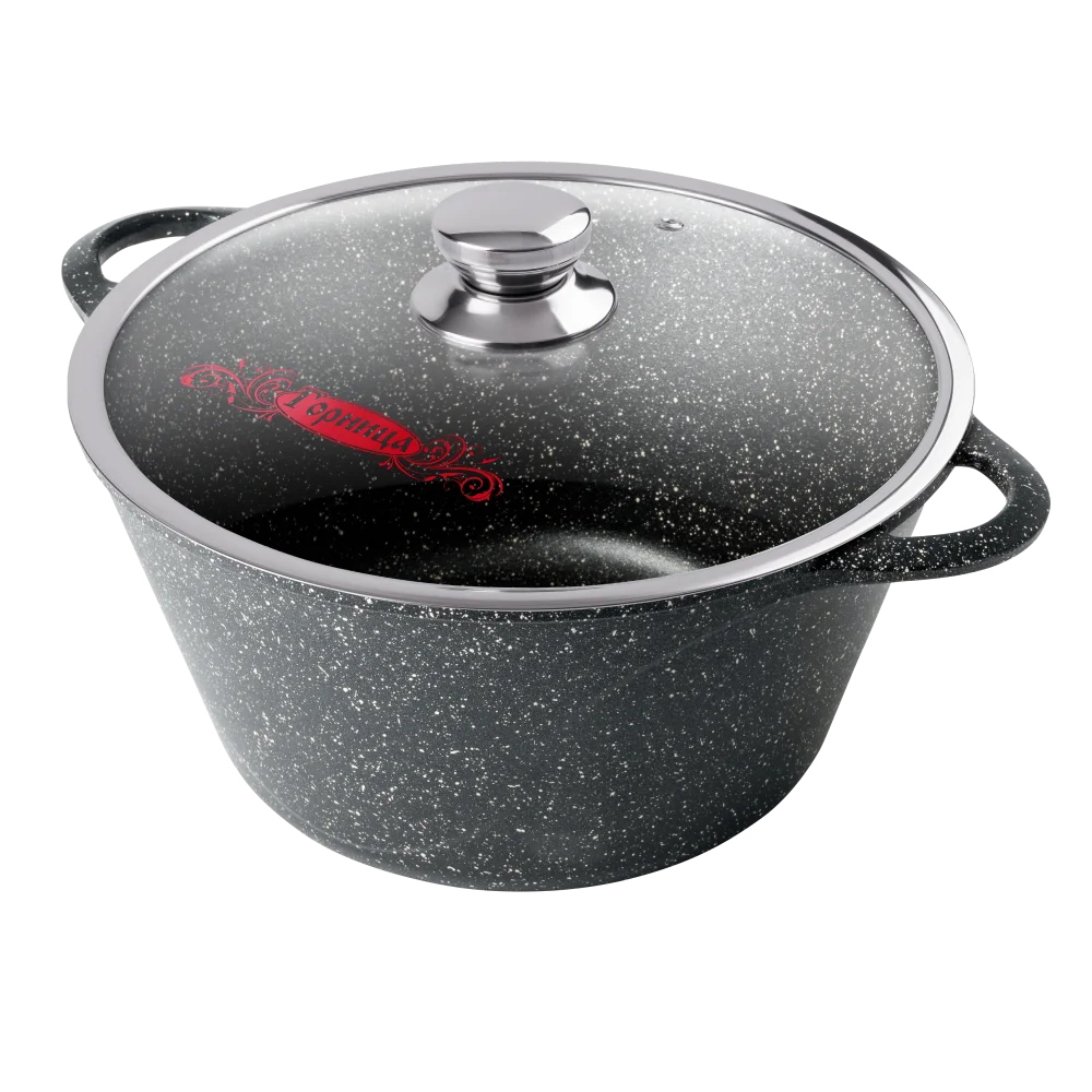 Литая алюминиевая кастрюля с антипригарным покрытием ТМ Горница подходит для газовых, электрических, стеклокерамических, индукционных плит. Электрическая духовка либо газовая также допускают использование кастрюли в процессе готовки. Идеальна для приготовления мяса, овощей, грибов, супов и т.д. «Гранит Induction». Посуда базовой коллекции «Гранит» с важной особенностью – наличием индукционного дна. Сочетание классического черного цвета с белым крапом подчеркивает такие качества посуды, как высокопрочность и долговечность, подобно настоящей породе граниту. Антипригарная кастрюля изготовлена из пищевого алюминия без канцерогенных веществ. Имеет толстые стенки и дно для обеспечения равномерного распределения тепла. Кастрюля металлическая имеет антипригарное покрытие на водной основе, которое создает защитный барьер между чистым алюминием и пищевыми продуктами. Кастрюли с антипригарным покрытием легко мыть благодаря их гладкой поверхности.