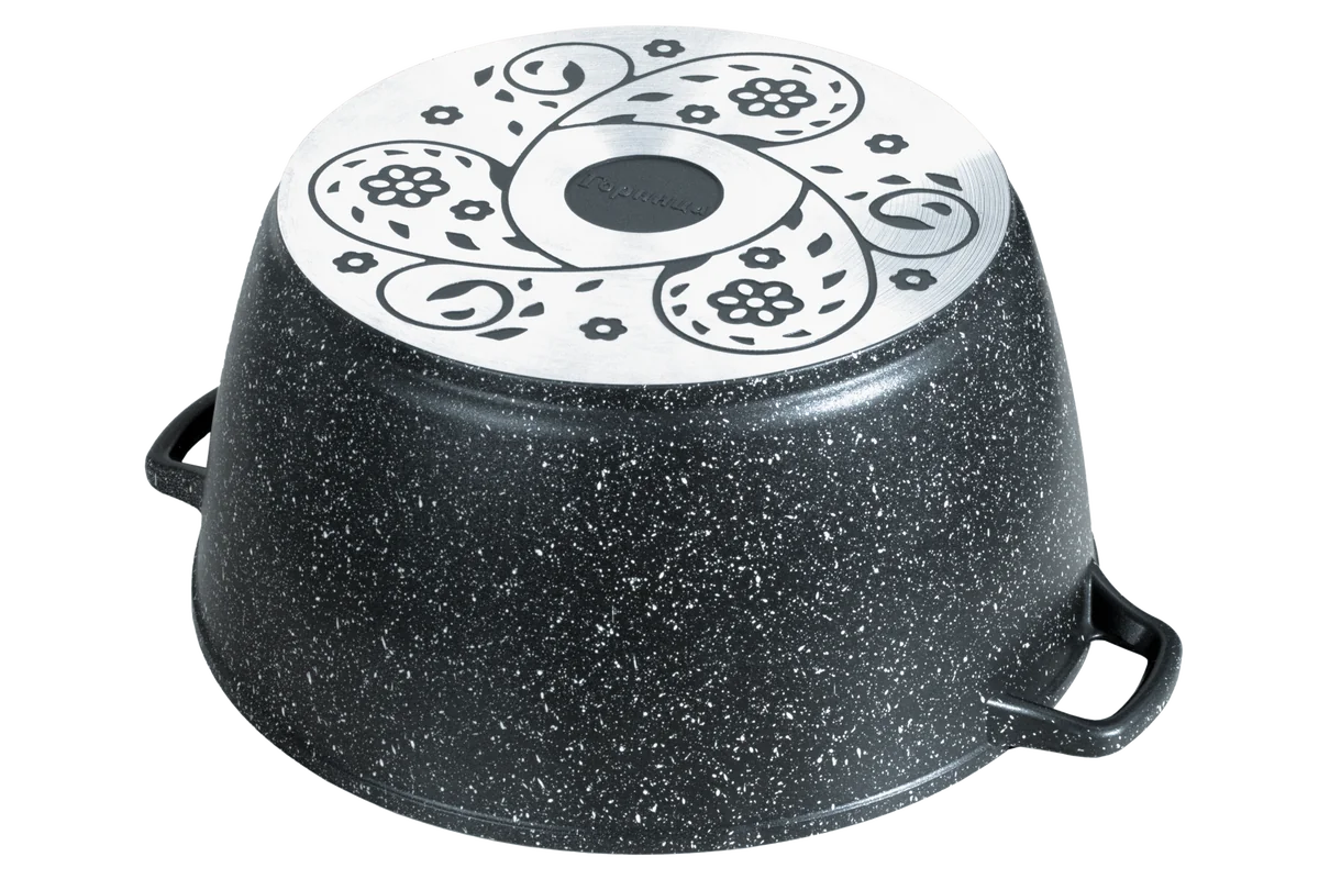Литой пищевой алюминий не имеет канцерогенных веществ и посторонних запахов. Толстые стенки и дно обеспечивают равномерное приготовление блюда. Посуда не деформируется при нагревании. Антипригарное покрытие на водной основе без вредных химических соединений: экологично и безопасно.