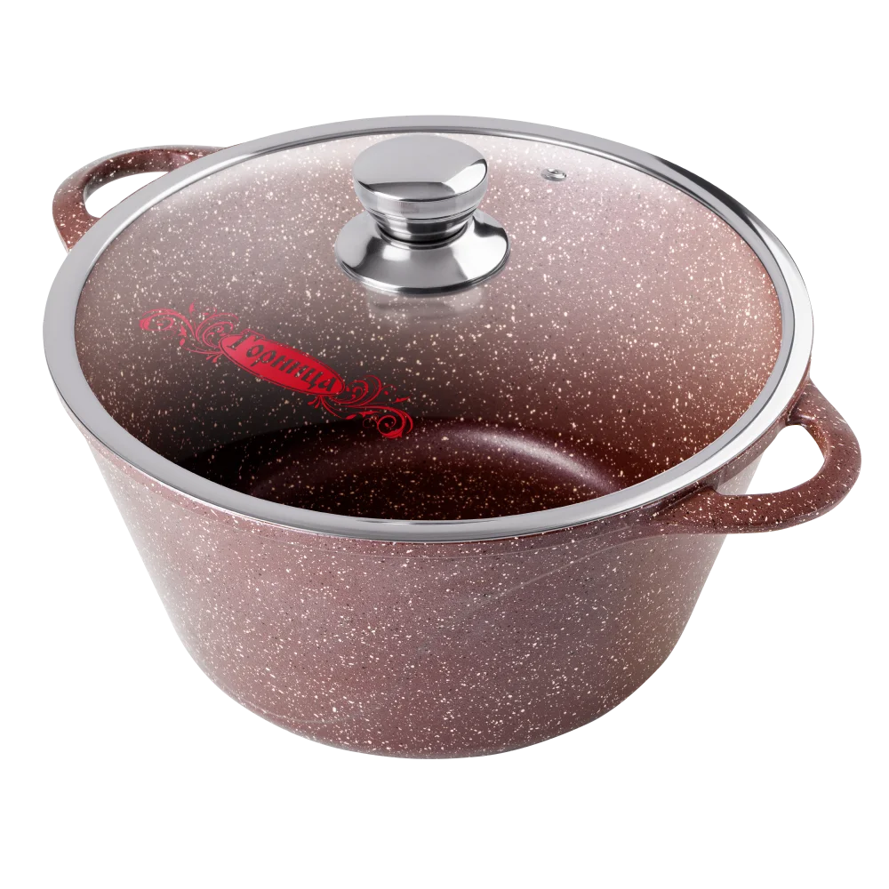 Литая алюминиевая кастрюля с антипригарным покрытием подходит для газовых, электрических и стеклокерамических плит. Кастрюли с цельнолитыми ручками можно использовать в духовом шкафу. «Шоколад». Коллекция посуды с улучшенным четырёхслойным антипригарным покрытием. Дополнительный слой с мраморным эффектом увеличивает износостойкость и создаёт оригинальный цветовой эффект мрамора шоколадного оттенка. Литой пищевой алюминий не имеет канцерогенных веществ и посторонних запахов. Толстые стенки и дно обеспечивают равномерное приготовление блюда. Посуда не деформируется при нагревании. Антипригарное покрытие на водной основе без вредных химических соединений: экологично и безопасно. Мелкие царапины не влияют на безопасность антипригарного покрытия. В кастрюле можно готовить без масла, ее легко мыть.