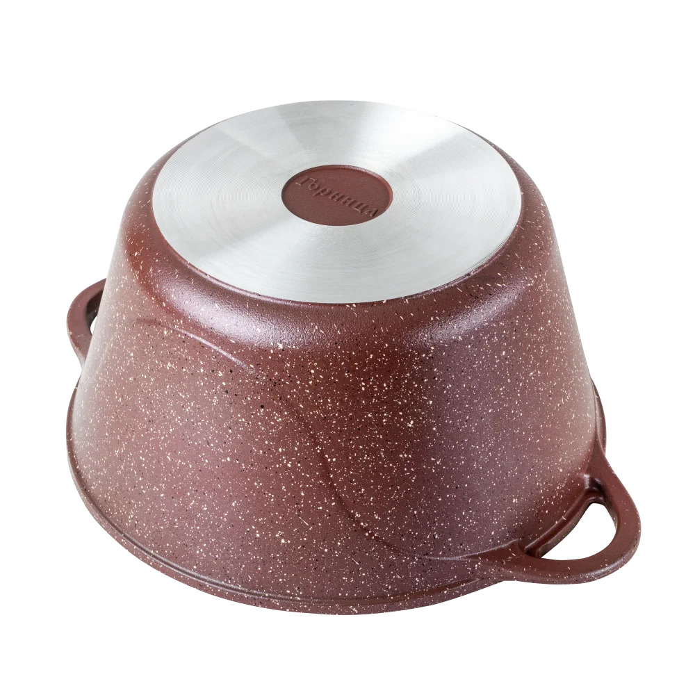 Литая алюминиевая кастрюля с антипригарным покрытием подходит для газовых, электрических и стеклокерамических плит. Кастрюли с цельнолитыми ручками можно использовать в духовом шкафу. «Шоколад». Коллекция посуды с улучшенным четырёхслойным антипригарным покрытием. Дополнительный слой с мраморным эффектом увеличивает износостойкость и создаёт оригинальный цветовой эффект мрамора шоколадного оттенка. Литой пищевой алюминий не имеет канцерогенных веществ и посторонних запахов. Толстые стенки и дно обеспечивают равномерное приготовление блюда. Посуда не деформируется при нагревании. Антипригарное покрытие на водной основе без вредных химических соединений: экологично и безопасно. Мелкие царапины не влияют на безопасность антипригарного покрытия. В кастрюле можно готовить без масла, ее легко мыть.