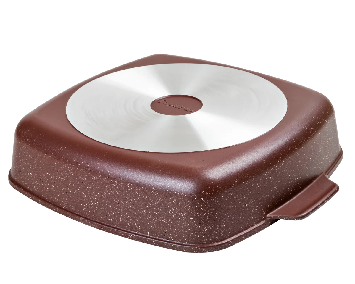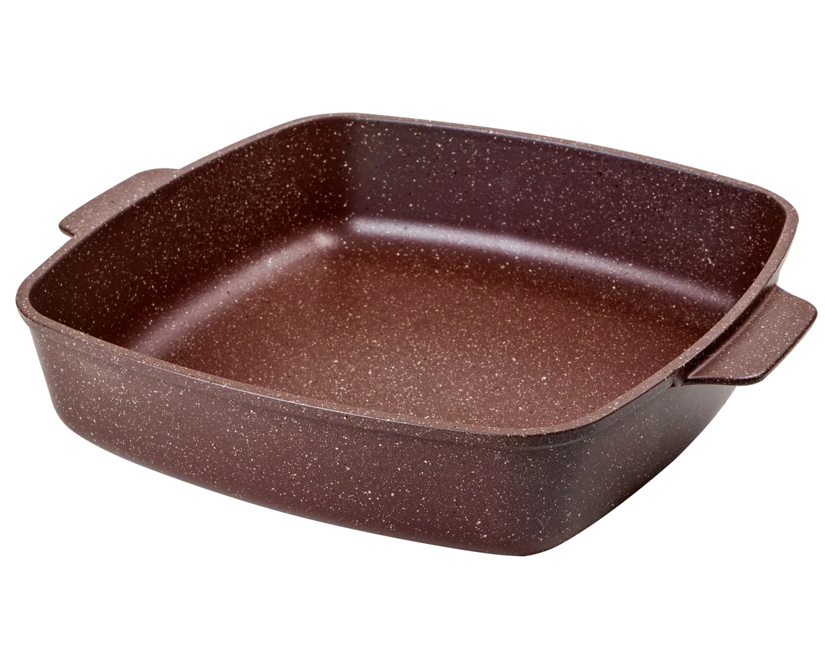 Дополнительный слой с мраморным эффектом увеличивает износостойкость и создаёт оригинальный цветовой эффект мрамора шоколадного оттенка. Литой пищевой алюминий не имеет канцерогенных веществ и посторонних запахов. Толстые стенки и дно обеспечивают равномерное приготовление блюда. Посуда не деформируется при нагревании. Антипригарное покрытие на водной основе без вредных химических соединений: экологично и безопасно. Мелкие царапины не влияют на безопасность антипригарного покрытия. На противнях можно готовить без масла, их легко мыть.
