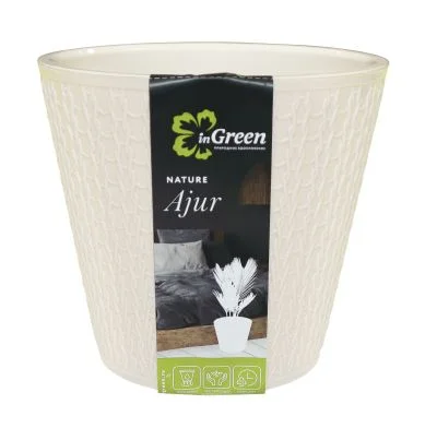 Коллекция Ajur отлично подойдет для тех, кто хочет добавить в свой дом тепло и нежность. Фактура горшка для цветов, выполненна в форме ажурной вязки, гармонично впишется в любое интерьерное пространство. Широкая линейка литражей в нежных тонах, создаст гармонию на вашем подоконнике. Гладкие стенки внутренней вставки препятствуют врастанию корней к стенкам горшка, облегчая пересадку. Воздух циркулирующий между внутренней вставкой и кашпо обеспечивает терморегуляцию корней, не давая им перегреваться на солнце. Горшки для цветов Ajur выполнены из прочного и легкого пластика. Не выгорают на солнце и не царапаются.