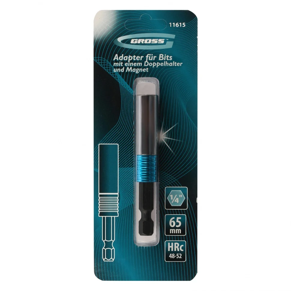 Адаптер для бит с двойным держателем и магнитом Gross 11615, 65 мм, 1/4" позволяет надежно зафиксировать и быстро заменить оснастку для монтажа и демонтажа резьбовых соединений. Фиксируется в патроне шуруповерта. Адаптер подойдет как для домашнего, так и для профессионального использования при сборке мебели, строительстве или ремонте.ПреимуществаБыстрозажимной механизм и встроенный магнит бита уверенно фиксируется без риска выпадения.Вращающаяся муфта можно удерживать битодержатель при работе, чтобы придать устойчивости крепежу и повысить эффективность работы.Система Quick-Lock бита освобождается одним движением, достаточно потянуть за муфту вниз.Повышенная износостойкость и долговечность адаптер изготовлен из хромованадиевой стали твердостью 48-52 HRC.