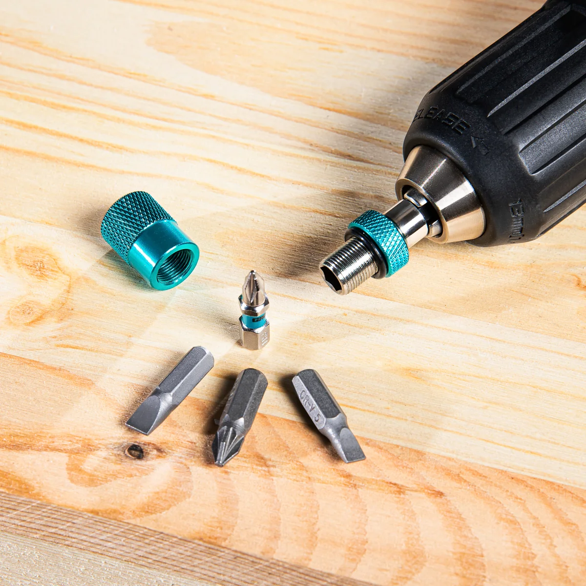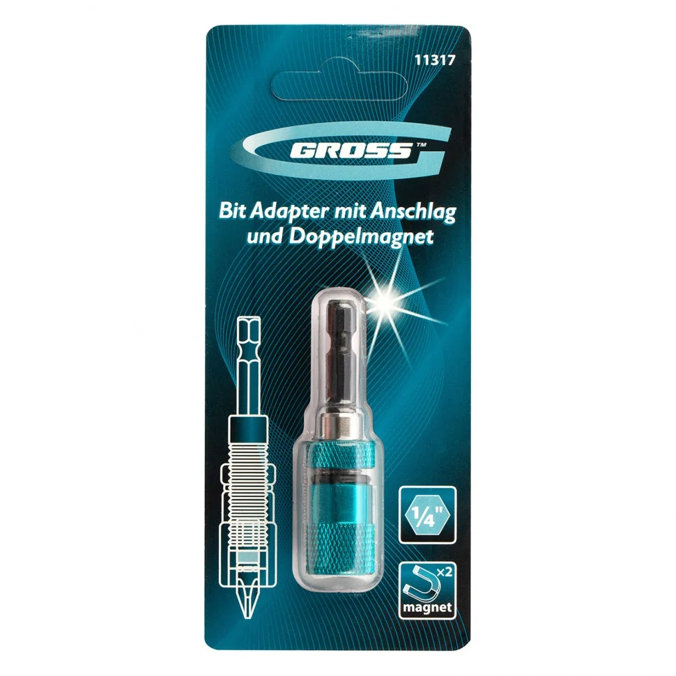 Адаптер для бит с ограничителем и двойным магнитом Gross 11317, 1/4 дюйма, обеспечивает уверенную фиксацию сменных насадок при работе с шуруповертами. Вставляется в патрон шуруповерта и позволяет быстро менять биты. Настраиваемый ограничитель глубины вкручивания предотвращает чрезмерное заглубление крепежа в гипсокартон и другие мягкие материалы и защищает их от повреждения.ПреимуществаАдаптер позволяет работать с мягкими материалами обычными битами, не имеющими ограничителя хода.Внутренний магнит надежно удерживает биту, а дополнительный внешний магнит на ограничителе обеспечивает удержание крепежа — это облегчает работу в труднодоступных местах и позволяет придерживать материал свободной рукой.Адаптер изготовлен из прочного хромованадиевого сплава повышенной износостойкости, что повышает срок его службы.