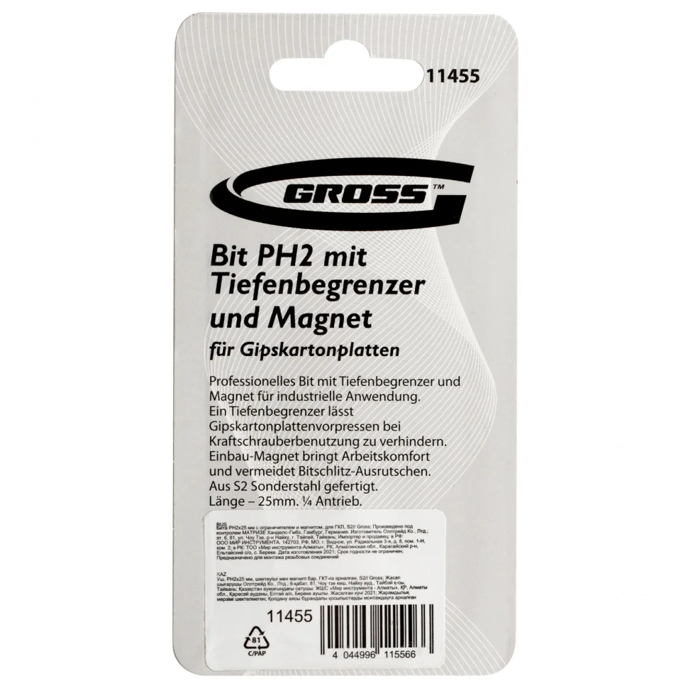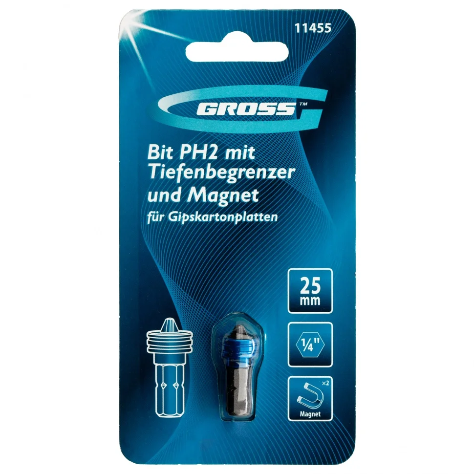 Крестообразная бита для ГКЛ Gross PH2 x 25 мм 11455 c ограничителем и магнитом, из стали S2, используется в качестве оснастки на шуруповертах и отвертках. Она оптимально подходит для монтажа и демонтажа саморезов со шляпками PH2 в гипсокартонные листы.ПреимуществаТочность работ — ограничитель хода предотвращает повреждение материалов — он упирается в поверхность и не допускает чрезмерного заглубления крепежа.Комфортная эксплуатация — крепеж надежно удерживается благодаря магниту, что позволяет работать шуруповертом одной рукой, а второй рукой придерживать ГКЛ.Долгий срок службы — бита изготовлена из японской легированной стали S2, обладает повышенным ресурсом и износостойкостью.Высокое качество — шлиц не проскальзывает в головке крепежа, выполнен с особой точностью, прошел максимальный контроль качества и термообработки.Антикоррозийная защита — никелированное покрытие увеличивает срок службы биты.