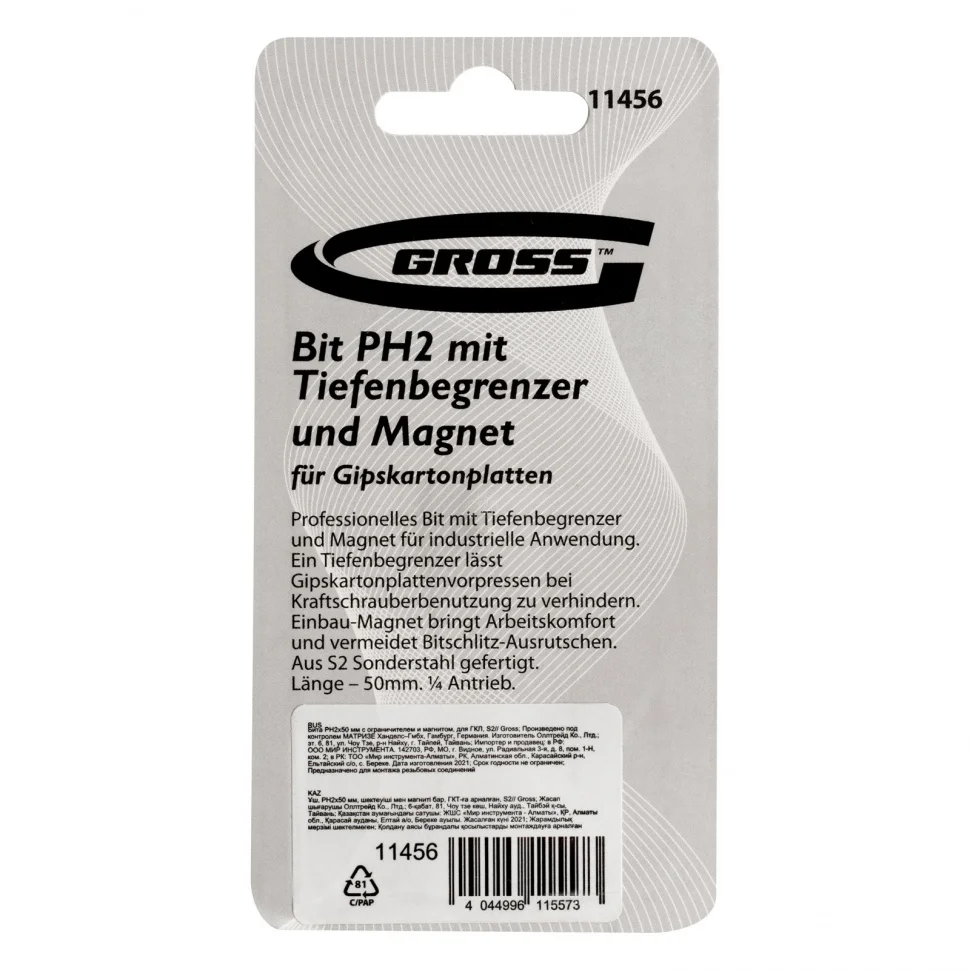 Крестообразная бита для ГКЛ Gross PH2 x 50 мм 11456 c ограничителем и магнитом, из стали S2, используется в качестве оснастки на шуруповертах и отвертках. Она оптимально подходит для монтажа и демонтажа саморезов со шляпками PH2 в гипсокартонные листы.ПреимуществаТочность работ — ограничитель хода предотвращает повреждение материалов — он упирается в поверхность и не допускает чрезмерного заглубления крепежа.Комфортная эксплуатация — крепеж надежно удерживается благодаря магниту, что позволяет работать шуруповертом одной рукой, а второй рукой придерживать ГКЛ.Долгий срок службы — бита изготовлена из японской легированной стали S2, обладает повышенным ресурсом и износостойкостью.Высокое качество — шлиц не проскальзывает в головке крепежа, выполнен с особой точностью, прошел максимальный контроль качества и термообработки.Антикоррозийная защита — никелированное покрытие увеличивает срок службы биты.