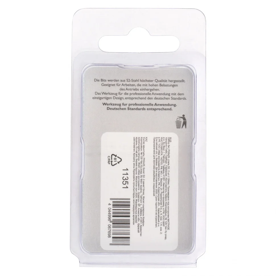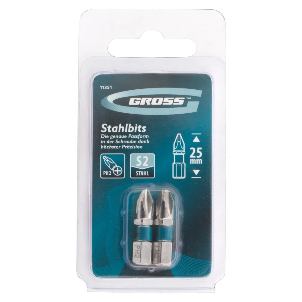 Набор бит PH2 х 25 мм Gross 11351, из стали S2, состоит из 2-х наиболее востребованных крестообразных насадок с хвостовиком 1/4 дюйма и предназначен для шуруповертов и отверток-адаптеров. Биты используются при монтаже и демонтаже большинства саморезов по дереву, шурупов и др. За счет оптимальной геометрии биты способны ввинтить и извлечь большое количество крепежа без потери рабочих свойств.ПреимуществаДолговечность и износоустойчивость — биты изготовлены из японской легированной стали S2 повышенной прочности и закалены до твердости 54-58 HRC.Качественное исполнение — высокая точность исполнения шлица и максимальный контроль на производстве в Тайване позволили добиться выверенности каждой биты и предотвратить проскальзывание рабочей части в головке крепежа.Удобная эксплуатация — намагниченный шлиц облегчает работу и позволяет направлять шуруповерт с насаженным крепежом одной рукой, а другой придерживать закрепляемую деталь.Антикоррозионные свойства — никелированное покрытие увеличивает срок службы насадок.Защита от подделок — цветное кольцо с логотипом ТМ Gross на каждой бите подтверждает оригинальность товара.Удобная упаковка — оснастка поставляется в жестком блистере с европодвесом.