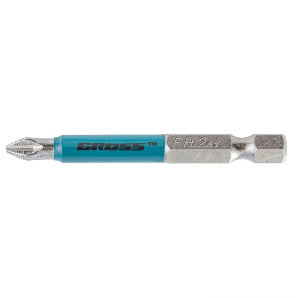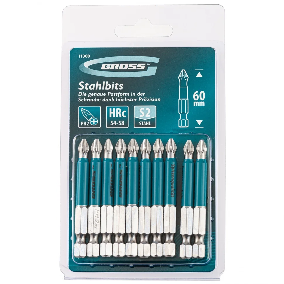 Набор односторонних бит Gross PH2x60 арт. 11300 состоит из 10 сменных насадок с крестообразными шлицами и шестигранными хвостовиками 1/4", рассчитанными на работу с шуруповертом. Профессиональная оснастка обеспечивает быстрый монтаж и демонтаж резьбовых соединений с углублением PH2.ПреимуществаДолговечность и износоустойчивость — биты изготовлены из японской легированной стали S2 повышенной прочности, закаленной до твердости 54-58 HRC.Каждая насадка имеет никелированное покрытие, исключающее образование коррозии.Насечки на шлице препятствуют проскальзыванию и «слизыванию» бит, дополнительно усиливают контроль при работе с саморезами по дереву, такое решение значительно увеличивает срок службы насадок.Намагниченный шлиц облегчает работу — крепеж удерживается битой, поэтому свободной рукой можно придерживать закрепляемую поверхность.Высокая результативность даже в ограниченном пространстве — благодаря удлиненному профилю 60 мм битами удобно работать в труднодоступных местах.10 штук в наборе — бит хватит на целую бригаду.Удобная упаковка — насадки поставляются в блистере с европодвесом.