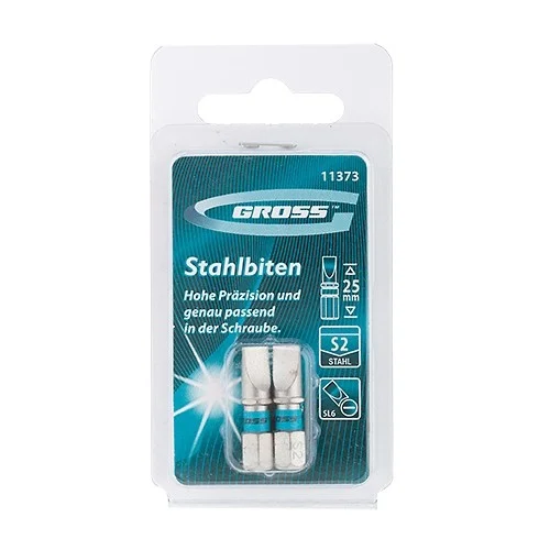 Набор бит Gross SL6,0х25 арт. 11373 включает 2 сменные насадки для шуруповертов и отверток-адаптеров с присоединительным шестигранником 1/4". Биты со шлицами «минус» размером 6 мм применяются при монтаже и демонтаже резьбовых соединений: винтов, саморезов и др.ПреимуществаБиты сделаны из японской легированной стали S2 твердостью 58-62 HRC, что повышает их износостойкость и увеличивает срок службы.Высокая точность исполнения шлица и максимальный контроль качества на производстве в Тайване позволяют добиться выверенности каждой биты и предотвратить проскальзывание рабочей части в головке крепежа.Намагниченный шлиц облегчает работу и позволяет направлять шуруповерт с насаженным крепежом одной рукой, а другой придерживать закрепляемую деталь.Никелированное покрытие защищает биты от коррозии.Каждая бита защищена от подделок — об этом говорит цветное кольцо с логотипом ТМ Gross.Оснастка поставляется в жестком блистере с европодвесом.
