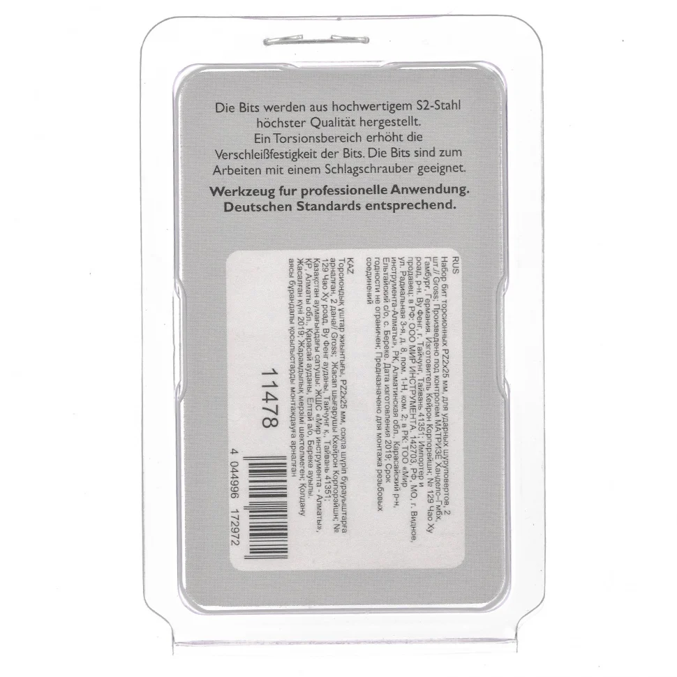 Набор торсионных бит PZ2 x 25 мм Gross 11478, 2 шт., предназначен для монтажа и демонтажа резьбовых соединений с помощью ударного шуруповерта. Он незаменим в строительных, слесарных и монтажных работах, в автосервисах, при проведении ремонта в доме. Торсионная зона способна пружинить, за счет чего она частично амортизирует тангенциальный удар от шуруповерта. Такое решение позволяет равномерно распределить нагрузку по бите и избежать поломки шлица.ПреимуществаДополнительные выступы между гранями — риск выскальзывания шлица из головки крепежа и поломки сведен к минимуму.Продуманная конструкция — торсионная зона позволяет работать ударным шуруповертом даже с особо твердыми поверхностями без риска поломки бит.Высококачественный материал изготовления — японская легированная сталь S2 обеспечивает устойчивость бит к износу и увеличивает их ресурс.Износостойкость — биты закалены до твердости 58-60 HRC, что повышает сопротивляемость к деформации.Надежная фиксация насадок — шлицы бит намагничены, поэтому крепеж не выпадет, а мастер сможет свободной рукой придерживать закрепляемый материал.Защита от подделок — синее кольцо с логотипом ТМ Gross подтверждает оригинальность товара.Удобное хранение — насадки поставляются в блистере с европодвесом, который можно вешать на стенд.