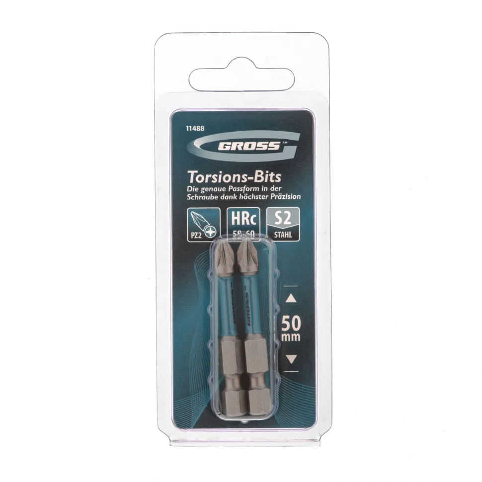 Набор торсионных бит PZ2 x 50 мм Gross 11488, 2 шт., предназначен для монтажа и демонтажа резьбовых соединений с помощью ударного шуруповерта. Он незаменим в строительных, слесарных и монтажных работах, в автосервисах, при проведении ремонта в доме. Торсионная зона способна пружинить, за счет чего она частично амортизирует тангенциальный удар от шуруповерта. Такое решение позволяет равномерно распределить нагрузку по бите и избежать поломки шлица.ПреимуществаДополнительные выступы между гранями — риск выскальзывания шлица из головки крепежа и поломки сведен к минимуму.Продуманная конструкция — торсионная зона позволяет работать ударным шуруповертом даже с особо твердыми поверхностями без риска поломки бит.Высококачественный материал изготовления — японская легированная сталь S2 обеспечивает устойчивость бит к износу и увеличивает их ресурс.Износостойкость — биты закалены до твердости 58-60 HRC, что повышает сопротивляемость к деформации.Надежная фиксация насадок — шлицы бит намагничены, поэтому крепеж не выпадет, а мастер сможет свободной рукой придерживать закрепляемый материал.Защита от подделок — синее кольцо с логотипом ТМ Gross подтверждает оригинальность товара.Удобное хранение — насадки поставляются в блистере с европодвесом, который можно вешать на стенд.