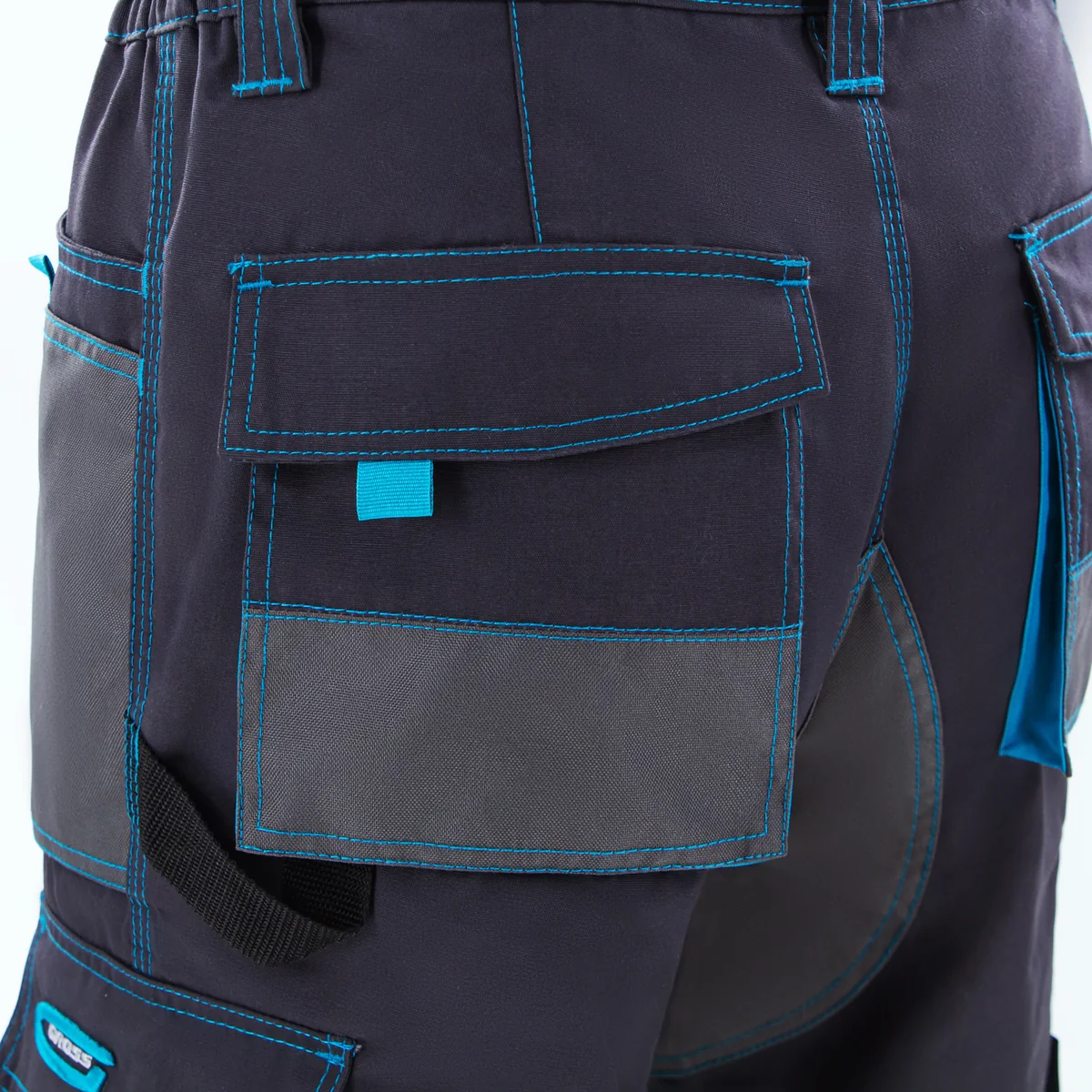 Универсальные брюки Gross 90351 размера XXXL подойдут для выполнения различных видов работ в теплое время года или в отапливаемом помещении. Они надежно защищают мастера от грязи, мелких повреждений и ссадин. В брюках предусмотрены защитные нашивки и 12 карманов для удобства работы.ПреимуществаНадежность и комфорт — изделие изготовлено из смесовой ткани (35% хлопок / 65% прочный полиэстер), обеспечивающей хороший воздухообмен, а также устойчивость к износу.Прочность и высокий ресурс — в местах наибольшей нагрузки имеются тройные усиленные швы, а также защитные нашивки из более плотной влагостойкой ткани.12 карманов — можно носить с собой необходимые инструменты и другие предметы.Карманы на липучках — мобильный телефон, крепеж и прочие мелочи не выпадут во время работы.Удобная посадка — у брюк имеется эластичный пояс и шлевки для ремня.Комфортная и безопасная работа — предусмотрены карманы для наколенных вкладышей (вкладыши приобретаются отдельно).