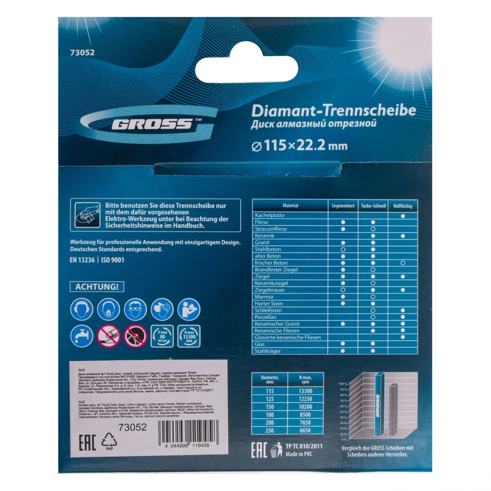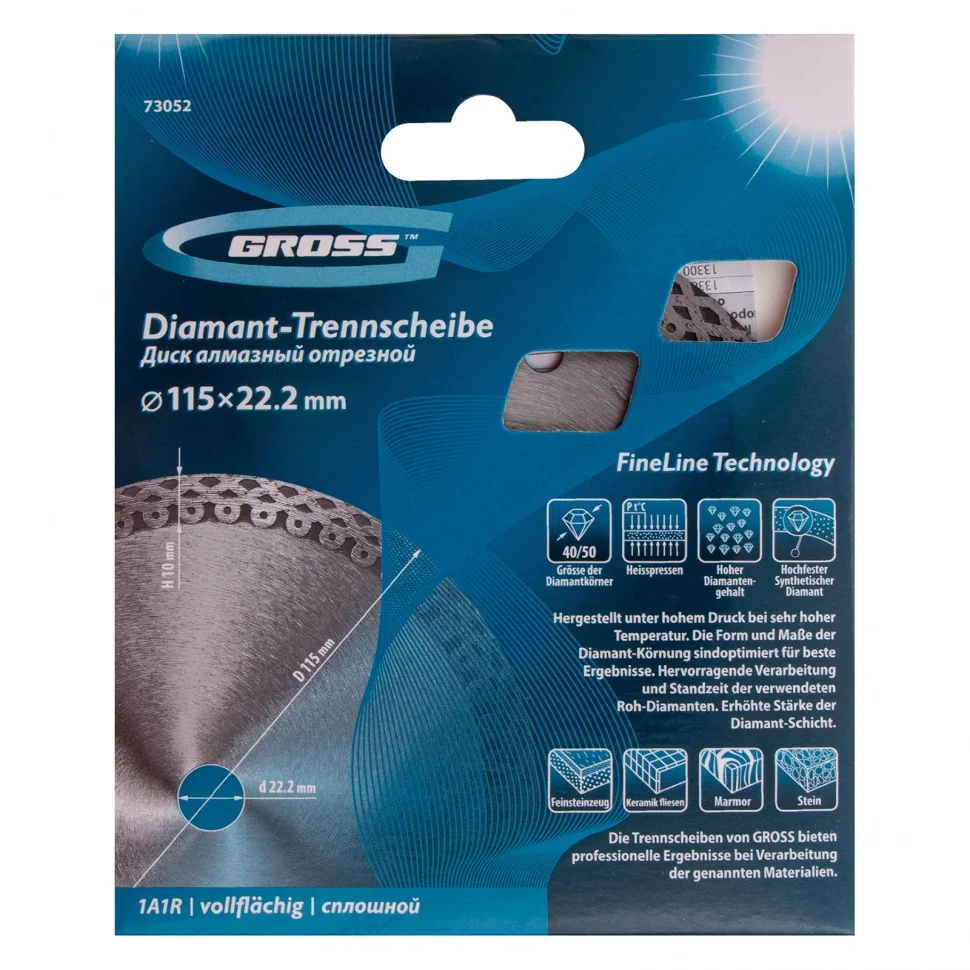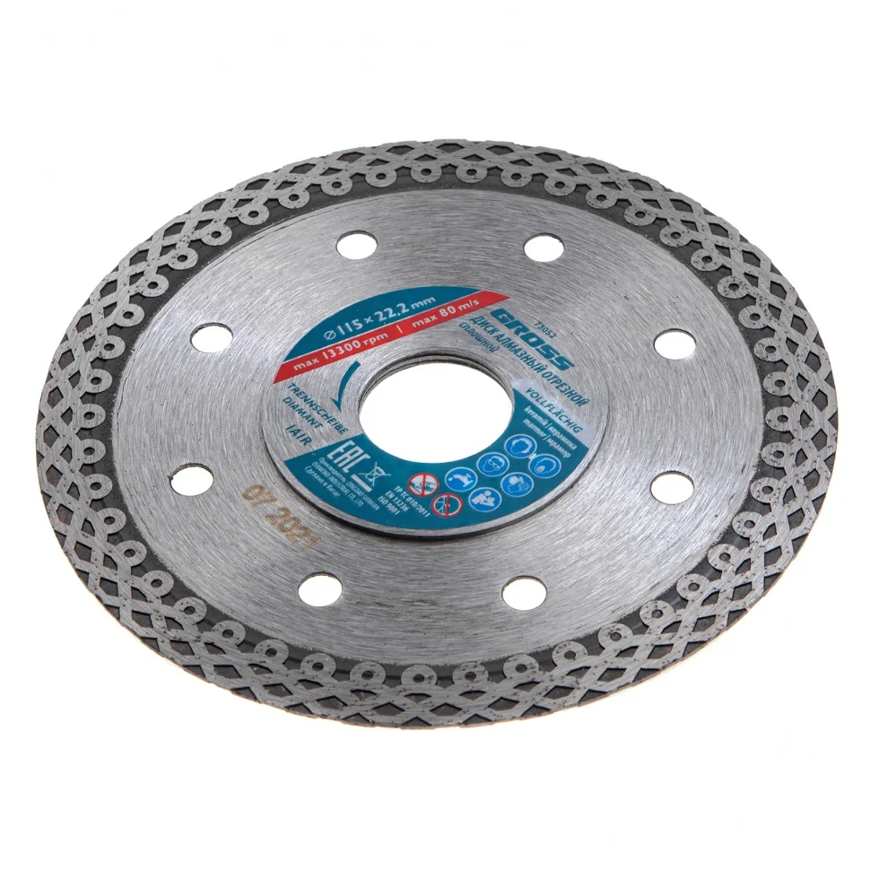 Тонкий сплошной алмазный диск Gross Jaguar ф115х22,2 мм 73052, мокрое резание, подходит для профессионального использования с УШМ или плиткорезами соответствующего типоразмера. Он используется для резки мокрым методом твердых материалов: гранита, керамогранита, плитки, мрамора и камня. Диск оставляет ровный срез без трещин и сколов за счет сплошной формы. При мокрой резке вода охлаждает диск и удаляет пыль с рабочей зоны, поэтому он легко справляется с большими объемами работ. Тонкий диск 1,2 мм значительно увеличивает скорость реза.ПреимуществаПродуманная форма рабочей части не только позволяет проводить мокрое шлифование, но и допускает кратковременное сухое резание материалов.В процессе изготовления диска используется горячее прессование, исключающее изъяны и гарантирующее точную форму.Высокая концентрация алмазов размером 40-50 мкм на широкой режущей части (10 мм) увеличивает производительность независимо от скорости реза.Качественные компоненты связки (кобальт, серебро и др.) обеспечивают высокий ресурс диска, устойчивость к перегреву и перегрузкам.Металлическая связка тщательно подобрана, а это значит, что диск одинаково эффективен для резки различных материалов.Корпус диска сделан из качественной инструментальной стали 65Mn с добавлением марганца, поэтому хорошо сохраняет форму даже при большом объеме работ.Корпус покрыт бесцветным лаком, не боится коррозии и рассчитан на долгую службу.