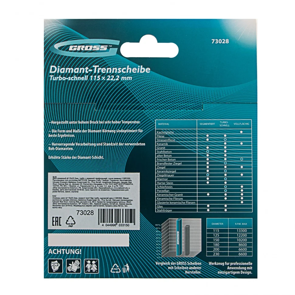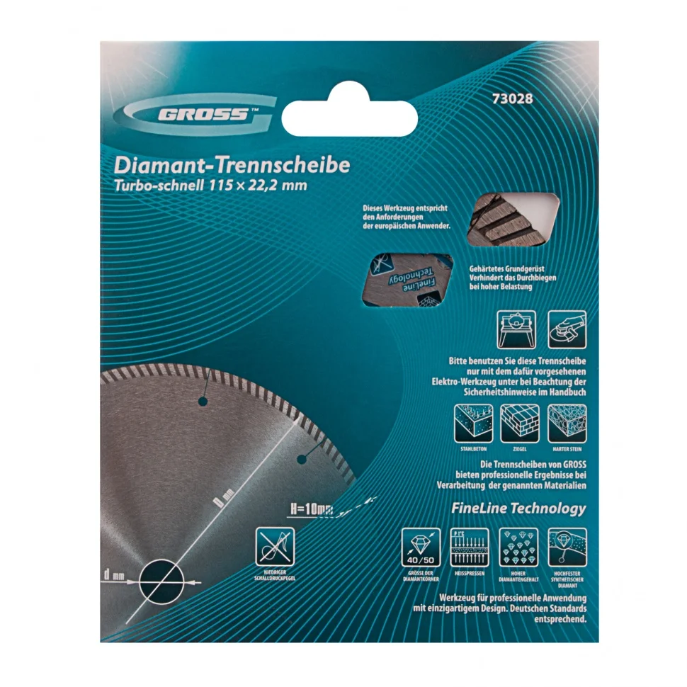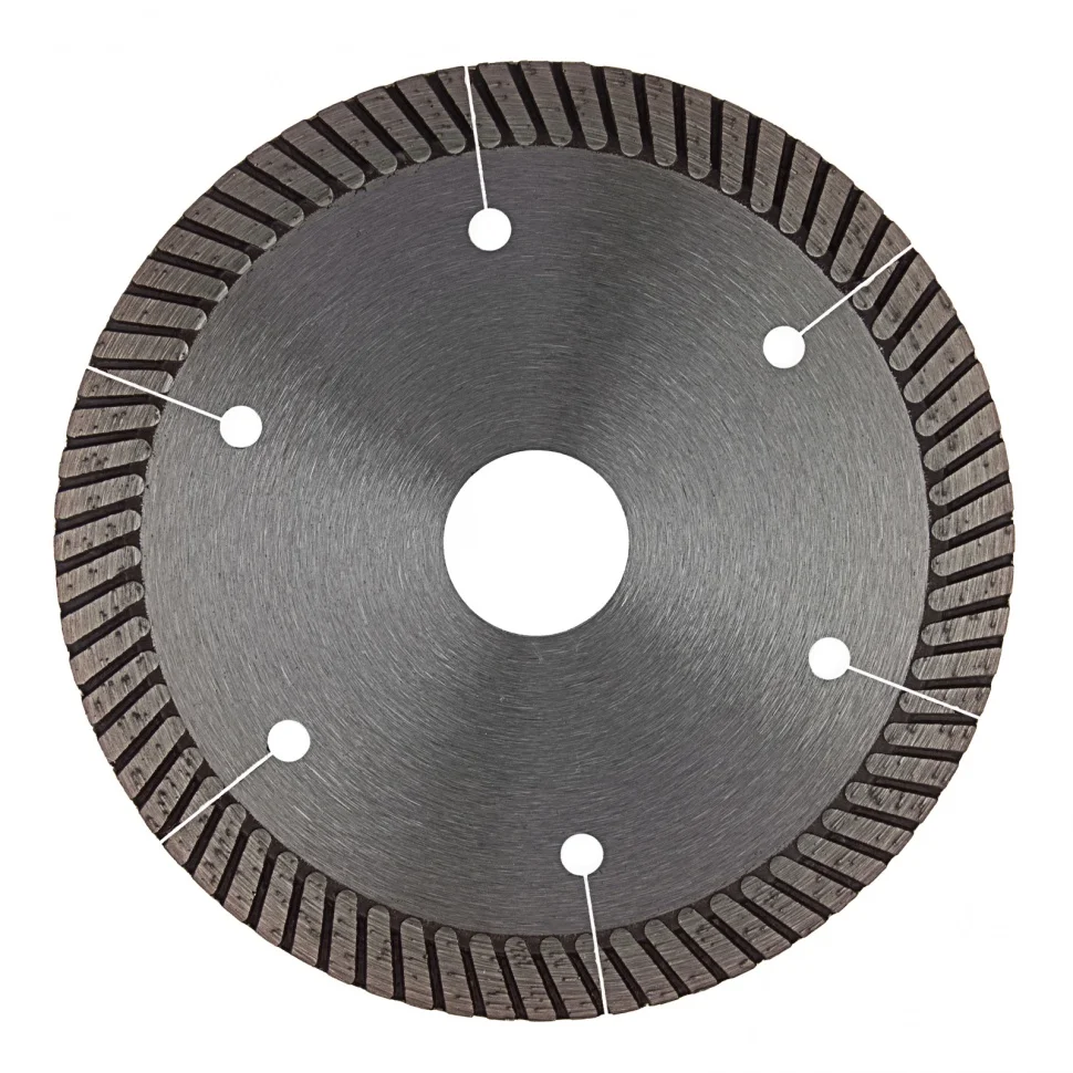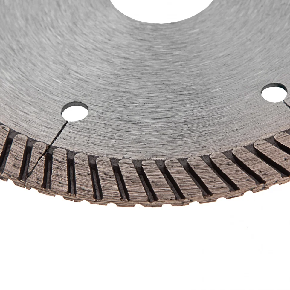 Алмазный диск Gross ф115 х 22,2 мм 73028 турбо с лазерной перфорацией применяется для сухого резания твердых материалов: бетона, в том числе свежего, железобетона, кирпича, гранита, камня и песчаника. Возможность работы с разными типами материалов обусловлена оптимально подобранной металлической связкой. Инструмент используется в качестве расходника на профессиональных УШМ. Лазерная перфорация обеспечивает усиленное охлаждение диска, поэтому он оптимален для интенсивной эксплуатации.Преимущества Турбированная форма рабочей части позволяет проводить быстрое резание сухим методом без необходимости использования водяного охлаждения. Диск отличается износостойкостью и высокой скоростью резки благодаря режущей части с высокой концентрацией алмазов 40-50 мкм. В качестве связки использованы только качественные компоненты (кобальт, серебро и др.), это позволило повысить ее устойчивость к перегрузкам, перегреву и увеличить ресурс диска. Ширина рабочей части составляет 10 мм, поэтому инструмент обеспечивает высокий ресурс для большого объема работ. Корпус сделан из инструментальной углеродистой стали 65Mn с добавлением марганца, поэтому диск сохраняет плоскостность при резке без риска деформации. Защитно-декоративное покрытие (бесцветный лак) предотвращает образование коррозии на корпусе.