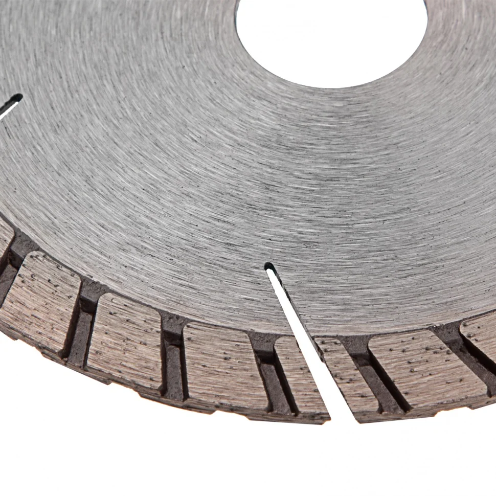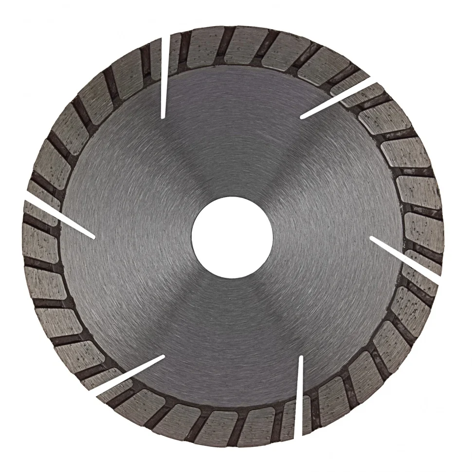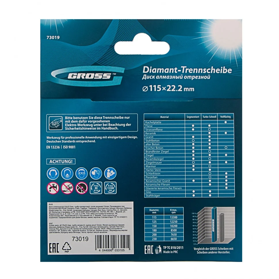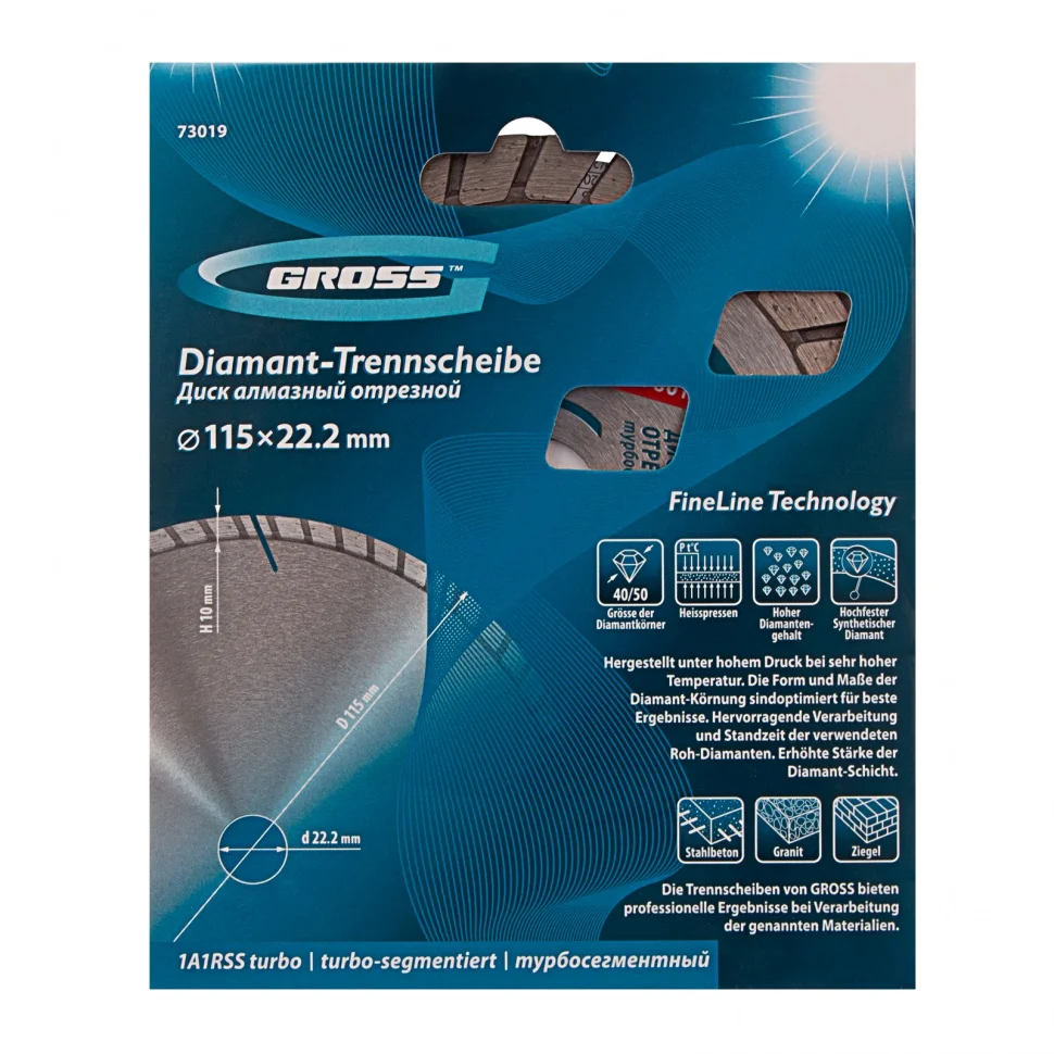 Алмазный турбо-сегментный диск Gross ф115 х 22,2 мм 73019 для сухого резания устанавливается на УШМ в качестве оснастки при проведении отрезных работ. Диск с турбированной рабочей частью универсален по своему применению и может использоваться для резки камня, гранита и кирпича, свежего бетона, а также слабоармированного железобетона. Он пригодится для интенсивных работ с профессиональным инструментом.Преимущества Турбо-сегментная форма — резание материалов происходит быстро, водяное охлаждение не требуется, в т.ч. при работе с армированным бетоном. Качественное исполнение — диск изготовлен методом горячего прессования, что позволило исключить изъяны и добиться точной формы. Износостойкость и скорость реза до 13300 об/мин — режущая часть выполнена из крупных алмазов размером 40-50 мкм. Рабочая часть 10 мм с высокой концентрацией алмазных зерен — диск идеально подходит для выполнения больших объемов работ. Оптимально подобранная металлическая связка — серебро, кобальт и другие составляющие значительно повышают ресурс диска, позволяют резать материалы разной плотности без риска перегрева. Прочный корпус с защитно-декоративным покрытием — сталь 65 Mn и бесцветный лак обеспечивают высокие эксплуатационные качества инструмента и коррозионную стойкость.