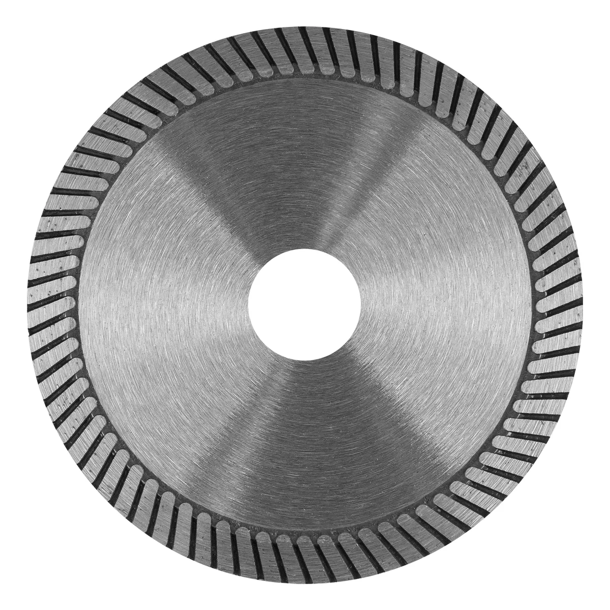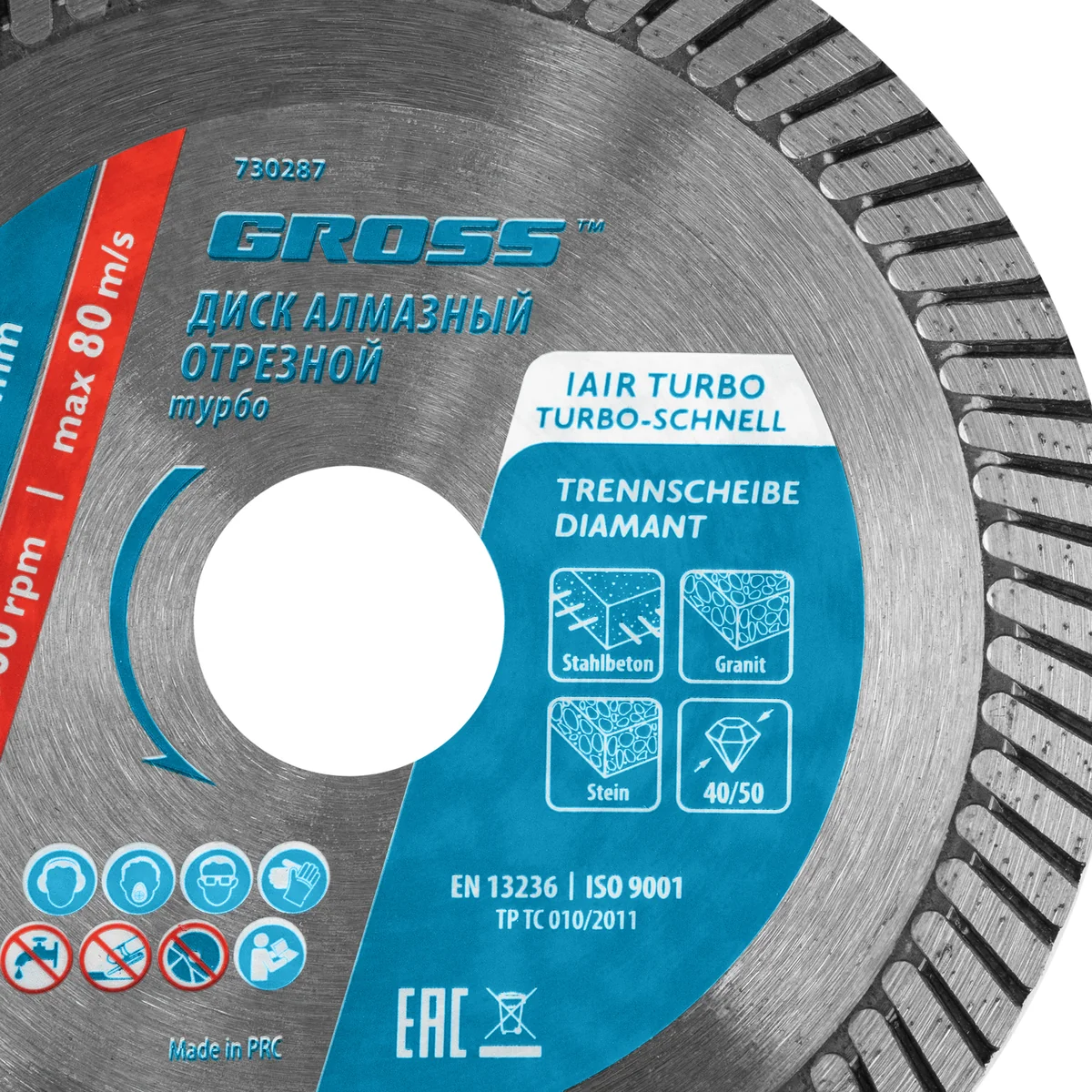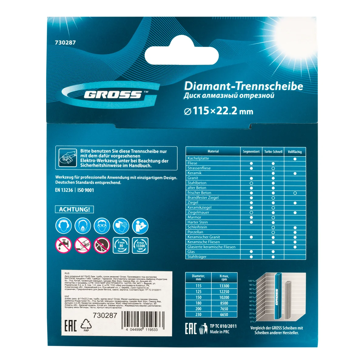 Алмазный диск Gross ф115х22,2мм 730287, турбо, позволяет осуществлять сухое резание бетона, в том числе недавно уложенного, среднеармированного железобетона, кирпича, гранита, камня, песчаника с помощью УШМ. Инструмент подходит для алмазной резки нескольких типов материалов благодаря турбированной рабочей части и оптимальному соотношению компонентов в металлической связке. Высокое качество диска делает его подходящим для профессионального применения.ПреимуществаТурбированная форма обеспечивает быструю алмазную резку сухим способом, прибегать к водяному охлаждению не нужно.Изготовление диска путем горячего прессования позволяет повысить его надежность и ресурс.Алмазный диск быстро режет материалы и отличается износостойкостью благодаря высокой концентрации алмазов и крупному размеру зерен 40-50 мкм.Широкая рабочая часть (10 мм) позволяет повысить производительность работ.Высококачественная связка из серебра, кобальта и других компонентов со временем истирается, раскрывая новый слой алмазов, поэтому диск рассчитан на долгую службу.Корпус диска выполнено из углеродистой стали 65Mn с добавлением марганца, который помогает улучшить пружинные свойства и защитить диск от искривления в процессе реза.Корпус имеет защитно-декоративное лаковое покрытие, поэтому не подвержен образованию коррозии.
