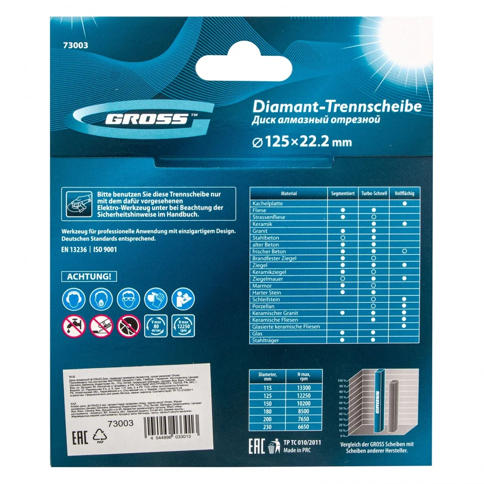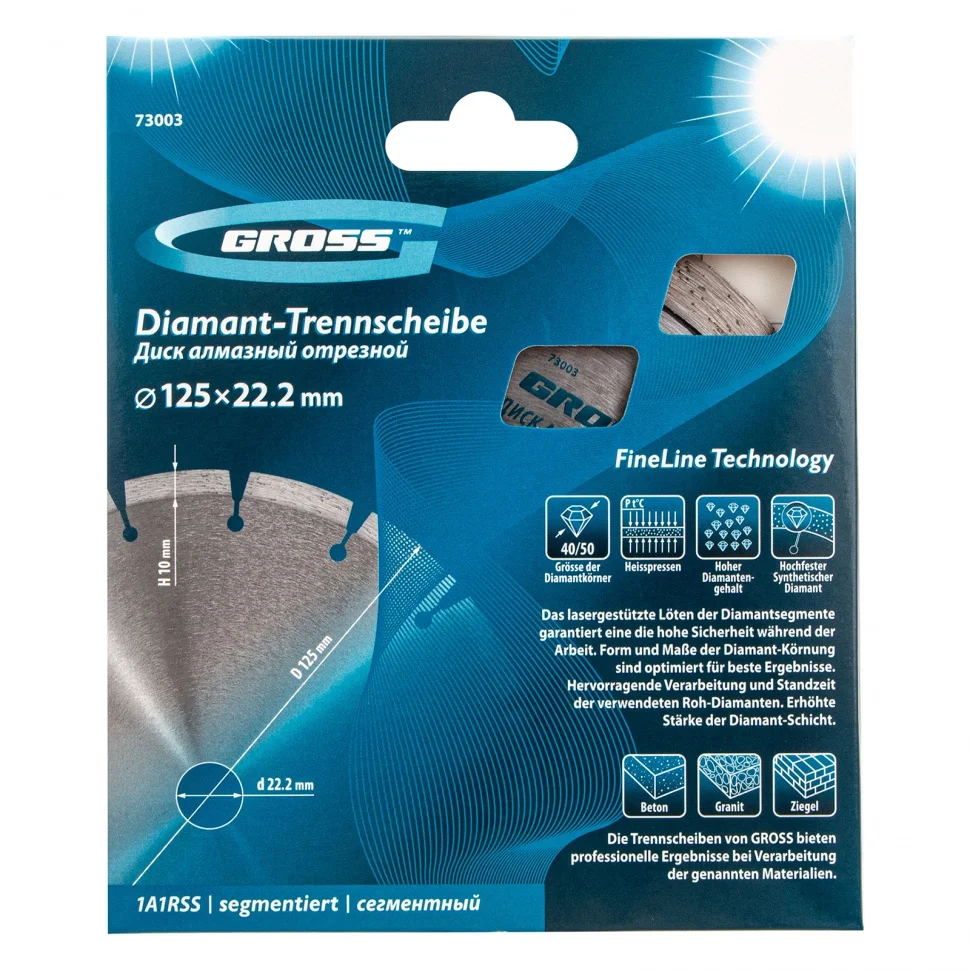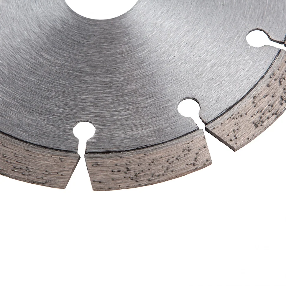 Алмазный диск Gross ф125 х 22,2 мм 73003 с лазерной приваркой сегментов предназначен для сухого резания бетона, в том числе свежего, кирпича, песчаника и гранита. Посадочный диаметр 22,2 мм позволяет использовать диск в качестве расходного инструмента для УШМ. Сегменты обеспечивают быстрое сухое резание без необходимости водяного охлаждения. За счет оптимально подобранной связки диск выдерживает перегрузки и подходит как для интенсивного бытового, так и для профессионального применения, когда требуется выполнить большой объем работ.Преимущества Сегментная форма — 10 прорезей в режущем слое способствуют небольшому изменению размера секторов диска в процессе сухого резания, что позволяет защитить его от деформации. Лазерная приварка сегментов — режущий алмазный слой прочно зафиксирован на корпусе, такая технология изготовления гарантирует надежность диска и высокую стойкость к нагрузкам. Ширина алмазного слоя 10 мм — диск гарантирует высокую производительность выполняемых работ. Высокая концентрация алмазов — режущая часть обеспечивает эффективность и большую скорость реза, т.к. изготовлена из качественных крупных зерен размером 40-50 мкм. Корпус из стали 65Mn — диск хорошо пружинит и сохраняет плоскостность в процессе реза, что увеличивает срок службы инструмента. Превосходное качество — диск изготовлен на высококлассном корейском оборудовании. Высокий рабочий ресурс — серебро, кобальт и другие дорогостоящие компоненты в составе металлической связки надежно удерживают алмазные зерна и обеспечивают равномерный износ и своевременное вскрытие на кромке новых алмазов. Защитно-декоративное покрытие — бесцветный лак повышает коррозионную стойкость инструмента.
