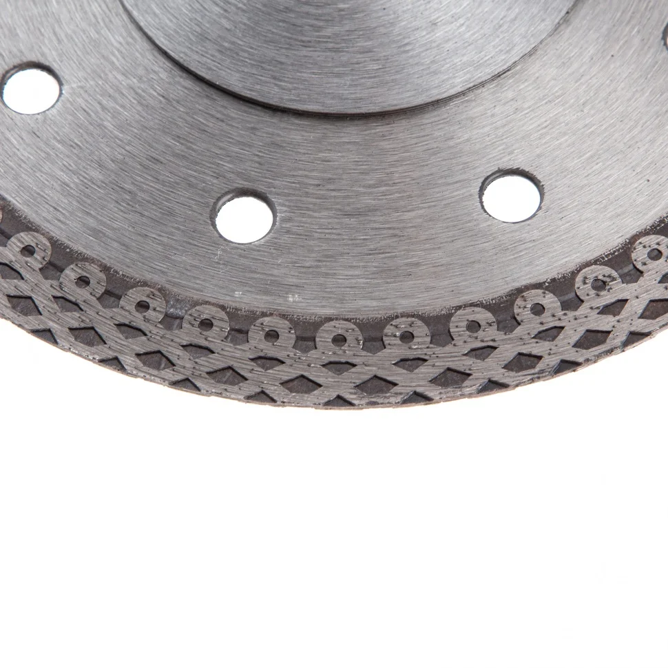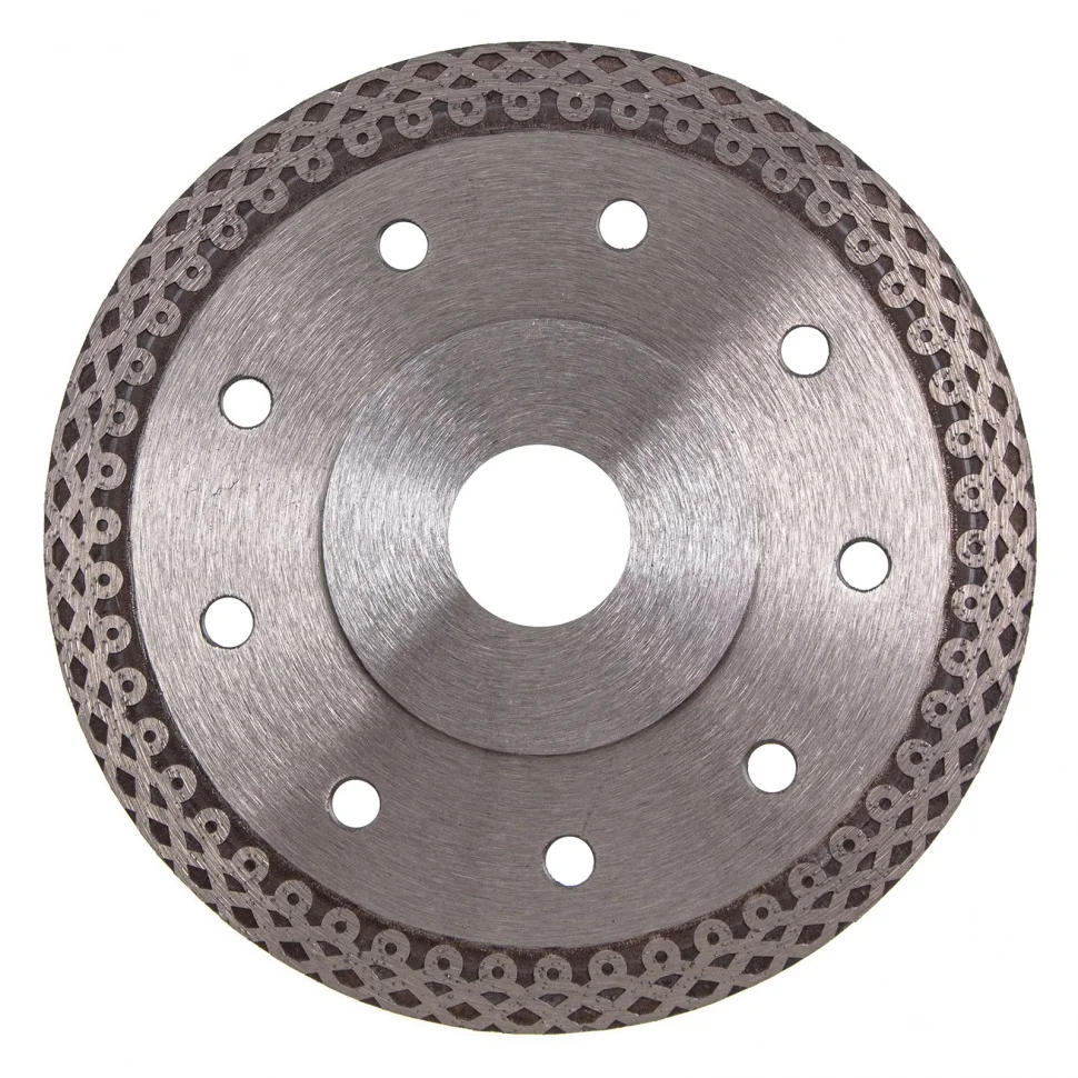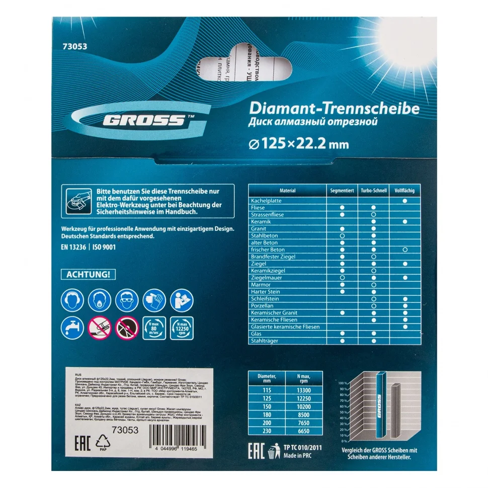 Тонкий сплошной алмазный диск Gross Jaguar ф125 х 22,2 мм 73053, подходит для профессионального мокрого резания с помощью УШМ или плиткореза соответствующего типоразмера. Используется для резки мокрым методом твердых материалов: гранита, керамогранита, плитки, мрамора и камня. Диск оставляет ровный срез без трещин и сколов за счет сплошной формы. При мокрой резке вода охлаждает диск и удаляет пыль с рабочей зоны, поэтому он легко справляется с большими объемами работ. За счет небольшой толщины диска 1,2 мм значительно увеличивается скорость реза.Преимущества Продуманная форма рабочей части не только позволяет проводить мокрое шлифование, но и допускает кратковременное сухое резание материалов. В процессе изготовления диска использовано горячее прессование, исключающее изъяны и гарантирующее точную форму. Высокая концентрация алмазов размером 40-50 мкм на широкой режущей части (10 мм) увеличивает производительность независимо от скорости реза. Качественные компоненты связки (кобальт, серебро и др.) обеспечивают высокий ресурс диска, устойчивость к перегреву и перегрузкам. Металлическая связка тщательно подобрана, а это значит, что диск одинаково эффективен для резки различных материалов. Корпус диска сделан из качественной инструментальной стали 65Mn с добавлением марганца, поэтому хорошо сохраняет форму даже при большом объеме работ. Корпус покрыт бесцветным лаком, не боится коррозии и рассчитан на долгую службу.