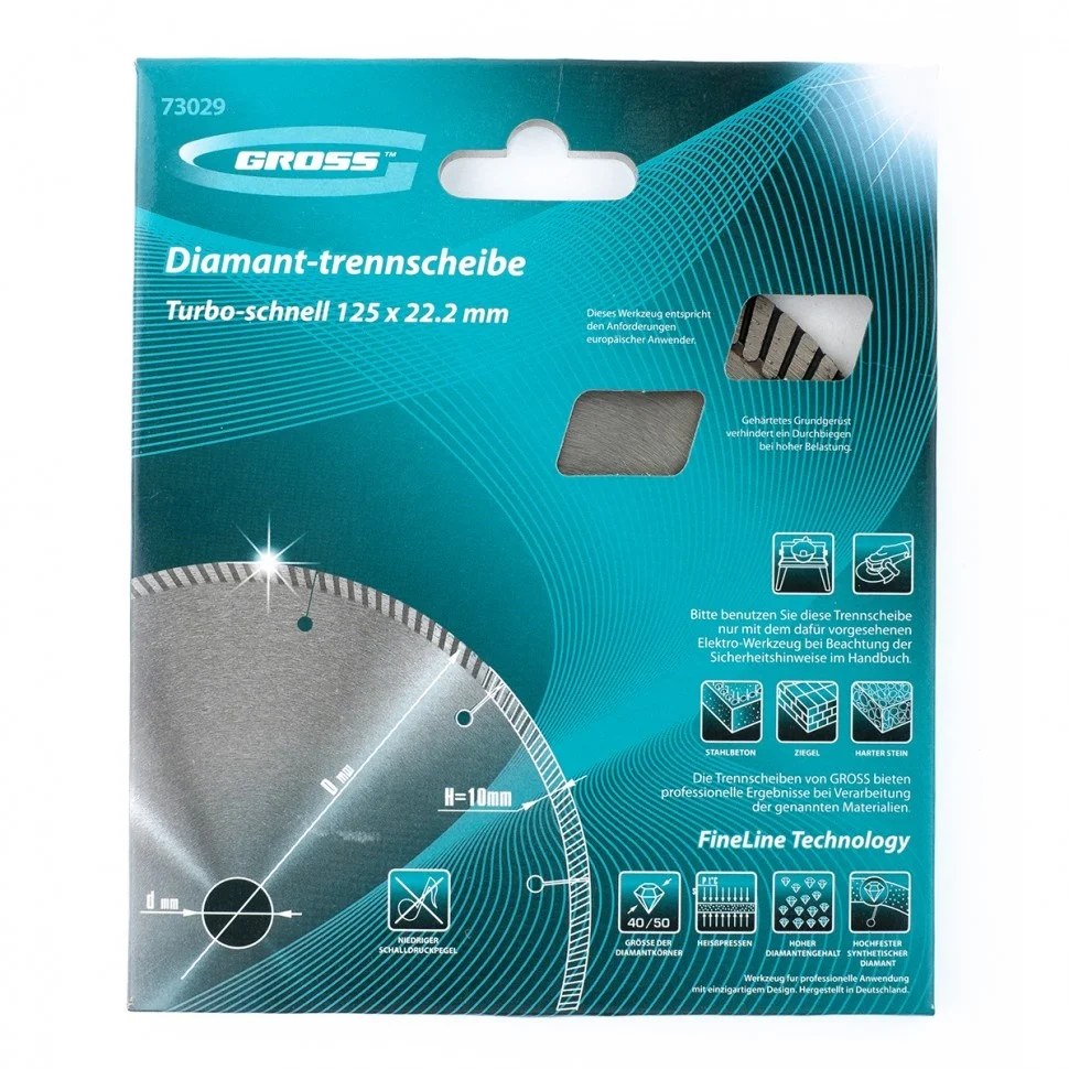 Алмазный диск Gross ф125х22,2 мм 73029 турбо с лазерной перфорацией применяется для сухого резания твердых материалов: бетона, в том числе свежего, железобетона, кирпича, гранита, камня и песчаника. Возможность работы с разными типами материалов обусловлена оптимально подобранной металлической связкой. Инструмент используется в качестве расходника на профессиональных УШМ. Лазерная перфорация обеспечивает усиленное охлаждение диска, поэтому он оптимален для интенсивной эксплуатации.ПреимуществаТурбированная форма рабочей части позволяет проводить быстрое резание сухим методом без необходимости использования водяного охлаждения.Диск отличается износостойкостью и высокой скоростью резки, благодаря режущей части с высокой концентрацией алмазов 40-50 мкм.В качестве связки используются только качественные компоненты (кобальт, серебро и др.), это позволяет повысить ее устойчивость к перегрузкам, перегреву и увеличить ресурс диска.Ширина рабочей части составляет 10 мм, поэтому инструмент обеспечивает высокий ресурс для большого объема работ.Корпус сделан из инструментальной углеродистой стали 65Mn с добавлением марганца, поэтому диск сохраняет плоскостность при резке без риска деформации.Защитно-декоративное покрытие бесцветным лаком предотвращает образование коррозии на корпусе.