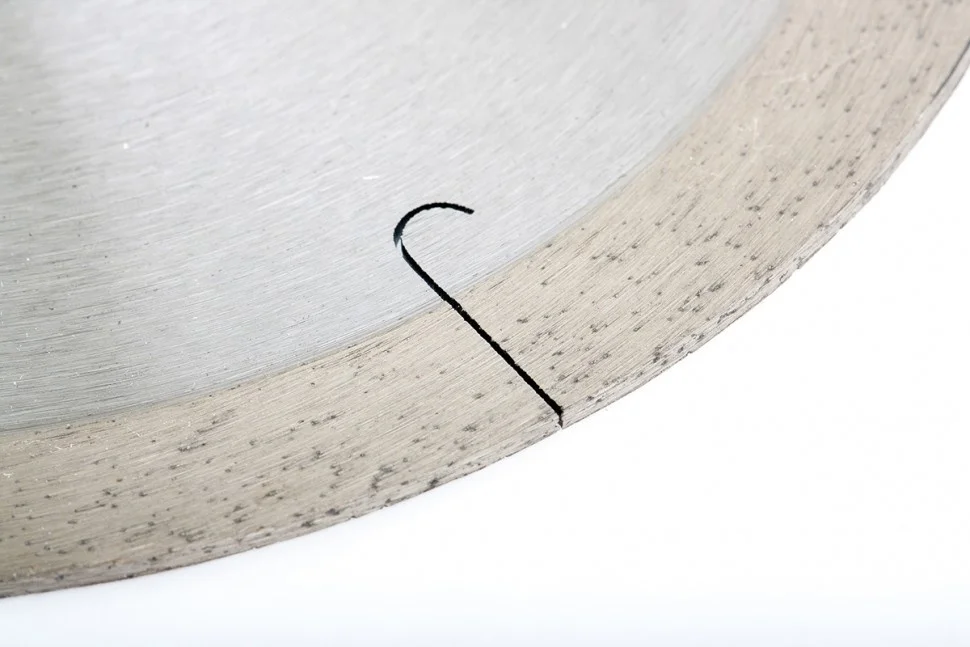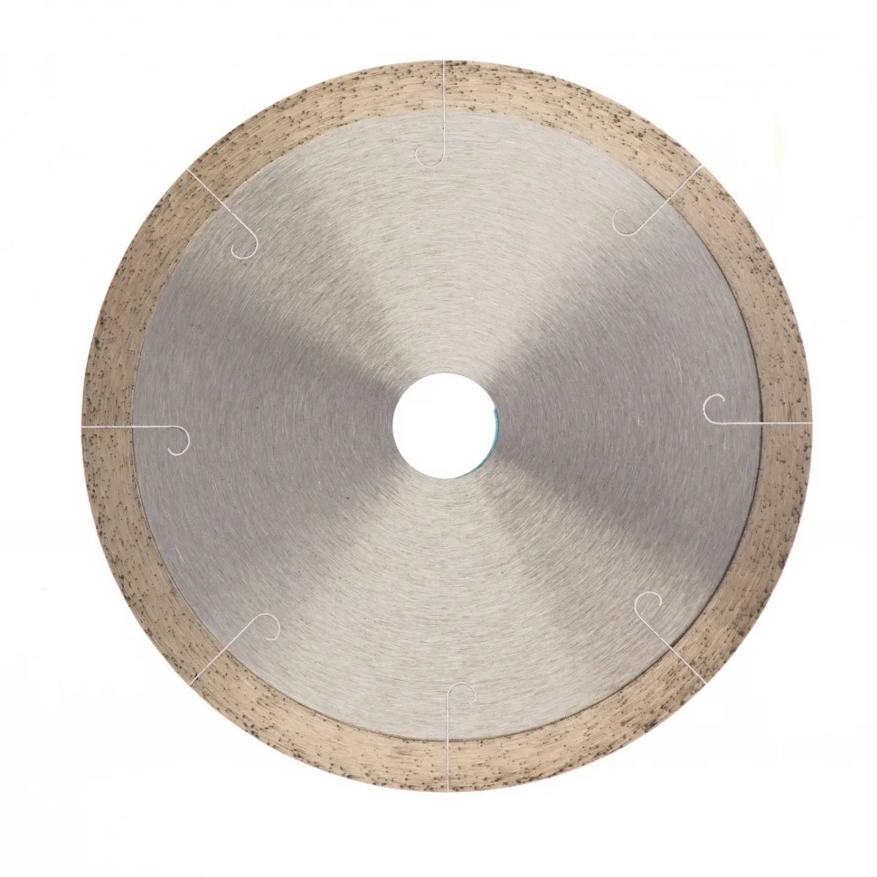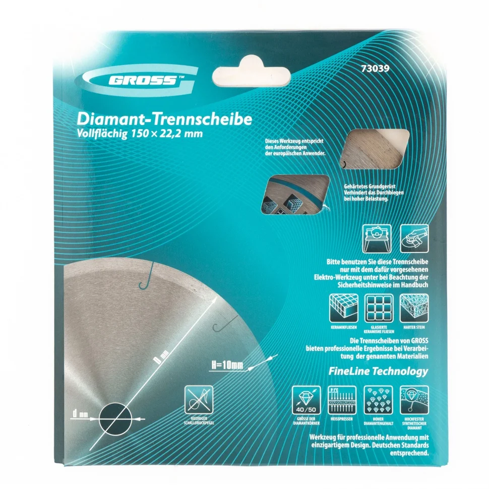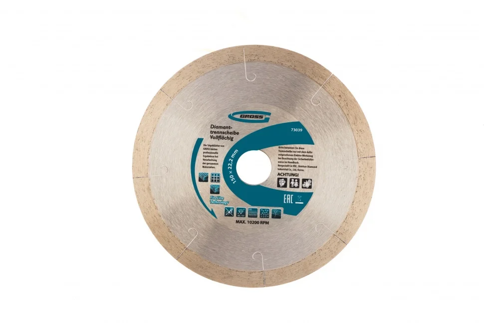 Сплошной алмазный диск Gross ф150х22,2 мм 73039 с лазерной перфорацией для мокрого резания используется в качестве расходника на УШМ или плиткорезах с посадочным размером 22,2 мм. Оптимальное соотношение серебра, кобальта и других качественных компонентов в металлической связке позволяет работать с гранитом, керамикой, керамогранитом, мрамором, натуральным и искусственным камнем. Метод мокрого шлифования подразумевает использование водяного охлаждения, что способствует снижению перегрева и эффективному отводу пыли.ПреимуществаДиск имеет большой ресурс, надежность и может использоваться профессионально, т.к. изготовлен по технологии горячего прессования.За счет сплошного типа диска обеспечивается качественный ровный срез без риска образования сколов.Высокая концентрация и крупный размер алмазов 40-50 мкм повышают скорость реза.Лазерная перфорация усиливает охлаждение диска, а значит, он легко выдерживает интенсивное использование.Режущая часть шириной 10 мм гарантирует стабильно высокую производительность.Стальной корпус имеет в составе марганец, который способствует усилению пружинных свойств и защите от искривления формы во время шлифования.Бесцветный лак предотвращает образование коррозии на корпусе диска.