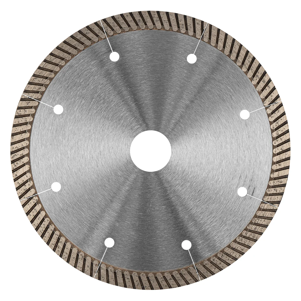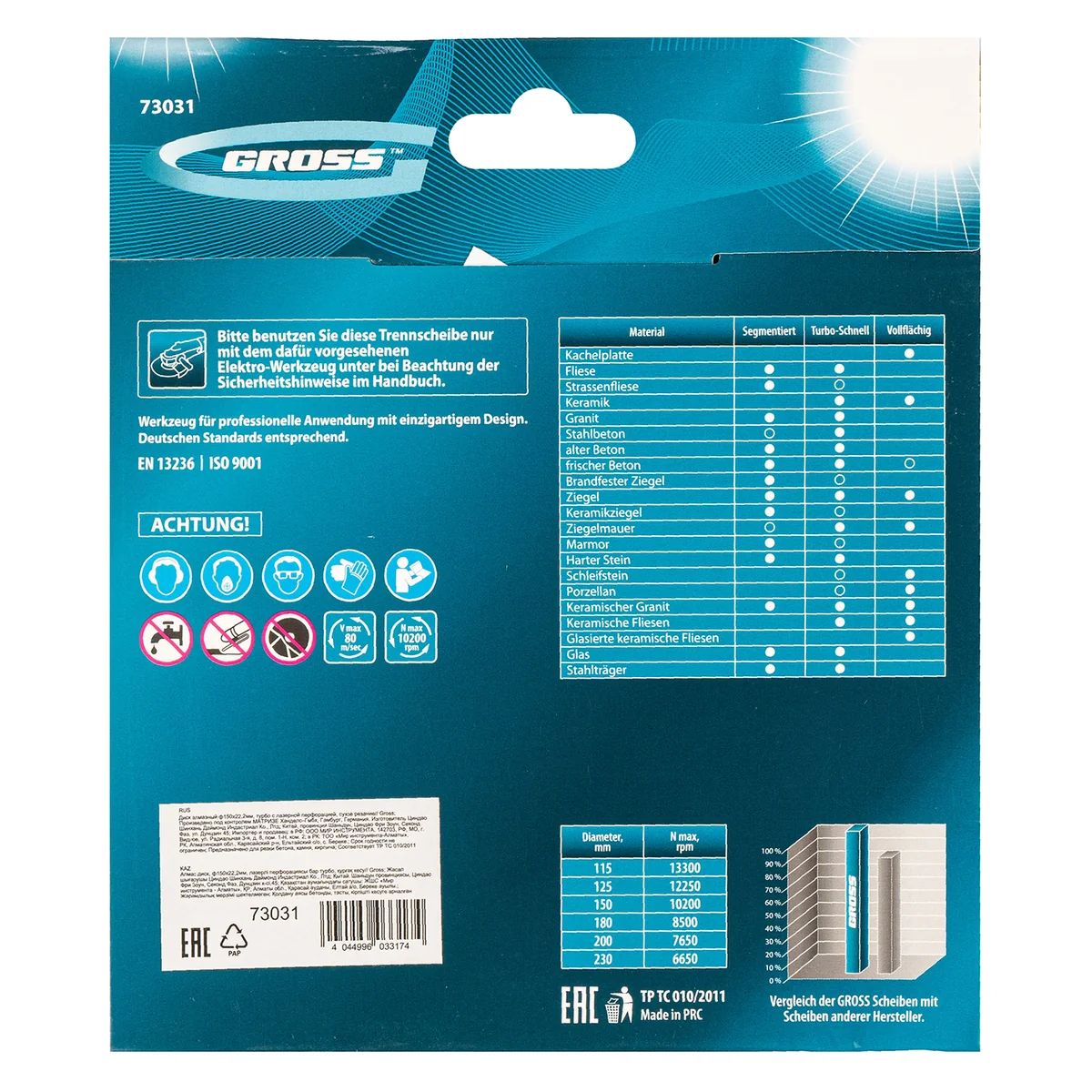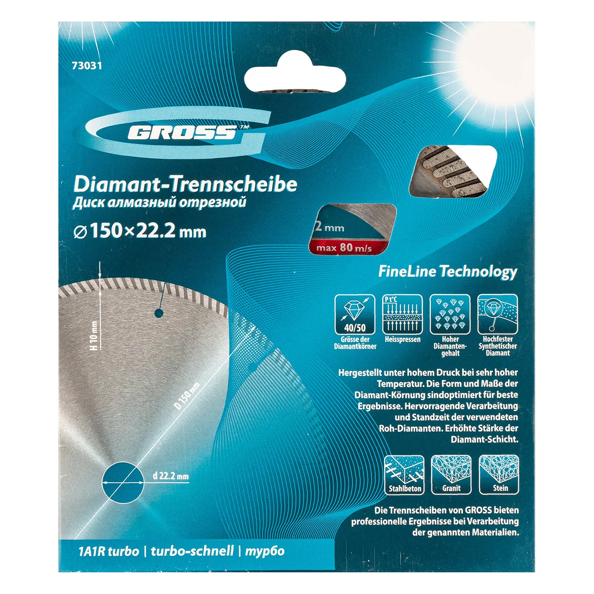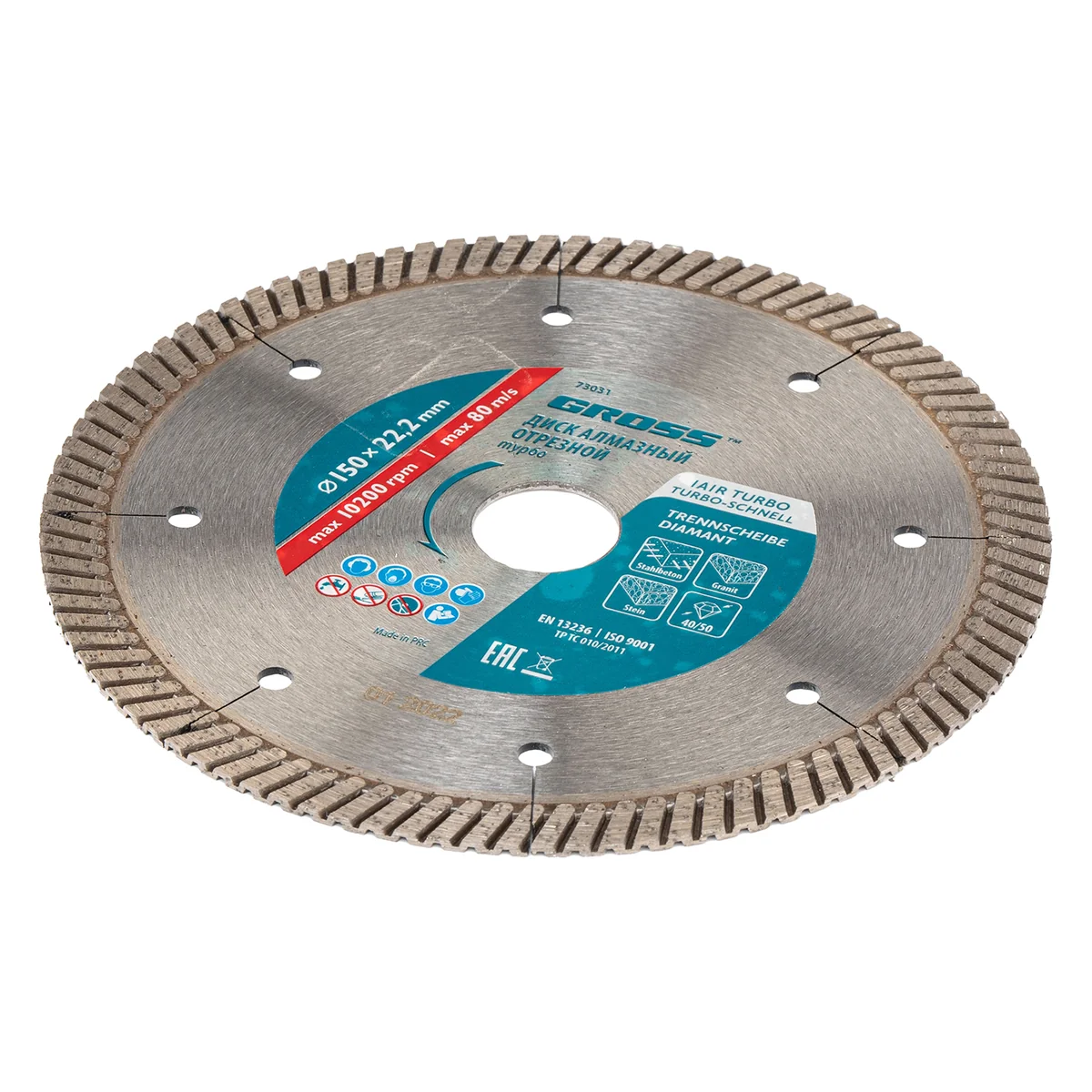 Алмазный диск Gross ф150х22,2 мм 73031 турбо с лазерной перфорацией применяется для сухого резания твердых материалов: бетона, в том числе свежего, железобетона, кирпича, гранита, камня и песчаника. Возможность работы с разными типами материалов обусловлена оптимально подобранной металлической связкой. Инструмент используется в качестве расходника на профессиональных УШМ. Лазерная перфорация обеспечивает усиленное охлаждение диска, поэтому он оптимален для интенсивной эксплуатации.ПреимуществаТурбированная форма рабочей части позволяет проводить быстрое резание сухим методом без необходимости использования водяного охлаждения.Диск отличается износостойкостью и высокой скоростью резки, благодаря режущей части с высокой концентрацией алмазов 40-50 мкм.В качестве связки используются только качественные компоненты (кобальт, серебро и др.), это позволяет повысить ее устойчивость к перегрузкам, перегреву и увеличить ресурс диска.Ширина рабочей части составляет 10 мм, поэтому инструмент обеспечивает высокий ресурс для большого объема работ.Корпус сделан из инструментальной углеродистой стали 65Mn с добавлением марганца, поэтому диск сохраняет плоскостность при резке без риска деформации.Защитно-декоративное покрытие бесцветным лаком предотвращает образование коррозии на корпусе.