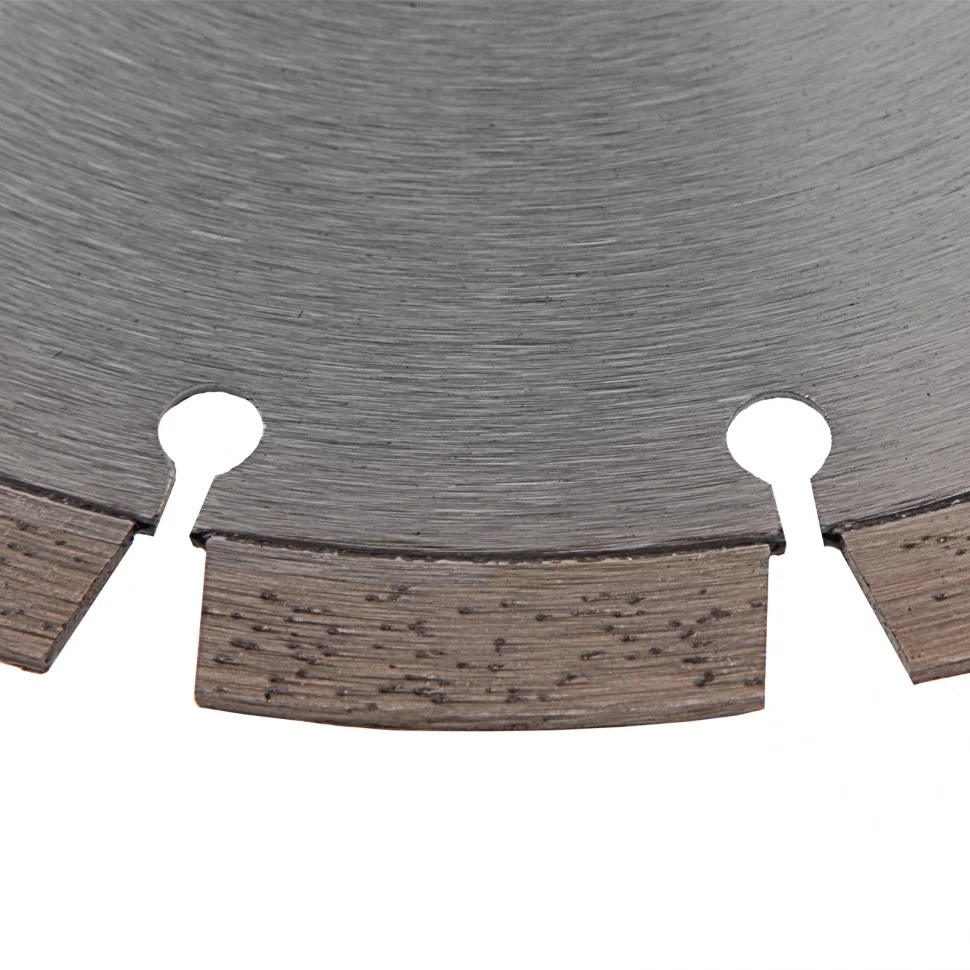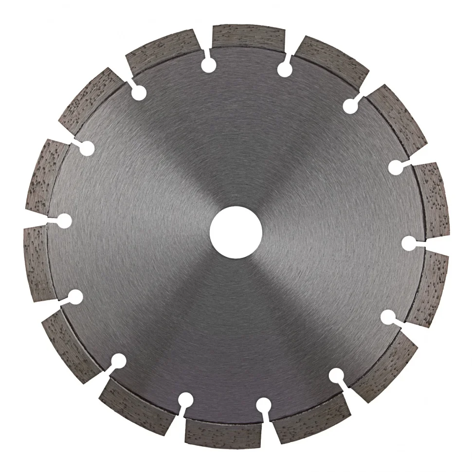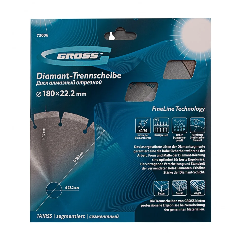 Алмазный диск Gross ф180 х 22,2 мм 73006 с лазерной приваркой сегментов предназначен для сухого резания бетона, в том числе свежего, кирпича, песчаника и гранита. Посадочный диаметр 22,2 мм позволяет использовать диск в качестве расходного инструмента для УШМ. Сегменты обеспечивают быстрое сухое резание без необходимости водяного охлаждения. За счет оптимально подобранной связки диск выдерживает перегрузки и подходит как для интенсивного бытового, так и для профессионального применения, когда требуется выполнить большой объем работ.Преимущества Сегментная форма — 14 прорезей в режущем слое способствуют небольшому изменению размера секторов диска в процессе сухого резания, что позволяет защитить его от деформации. Лазерная приварка сегментов — режущий алмазный слой прочно зафиксирован на корпусе, такая технология изготовления гарантирует надежность диска и высокую стойкость к нагрузкам. Ширина алмазного слоя 10 мм — диск гарантирует высокую производительность выполняемых работ. Высокая концентрация алмазов — режущая часть обеспечивает эффективность и большую скорость реза, т.к. изготовлена из качественных крупных зерен размером 40-50 мкм. Корпус из стали 65Mn — диск хорошо пружинит и сохраняет плоскостность в процессе реза, что увеличивает срок службы инструмента. Превосходное качество — диск изготовлен на высококлассном корейском оборудовании. Высокий рабочий ресурс — серебро, кобальт и другие дорогостоящие компоненты в составе металлической связки надежно удерживают алмазные зерна и обеспечивают равномерный износ и своевременное вскрытие на кромке новых алмазов. Защитно-декоративное покрытие — бесцветный лак повышает коррозионную стойкость инструмента.