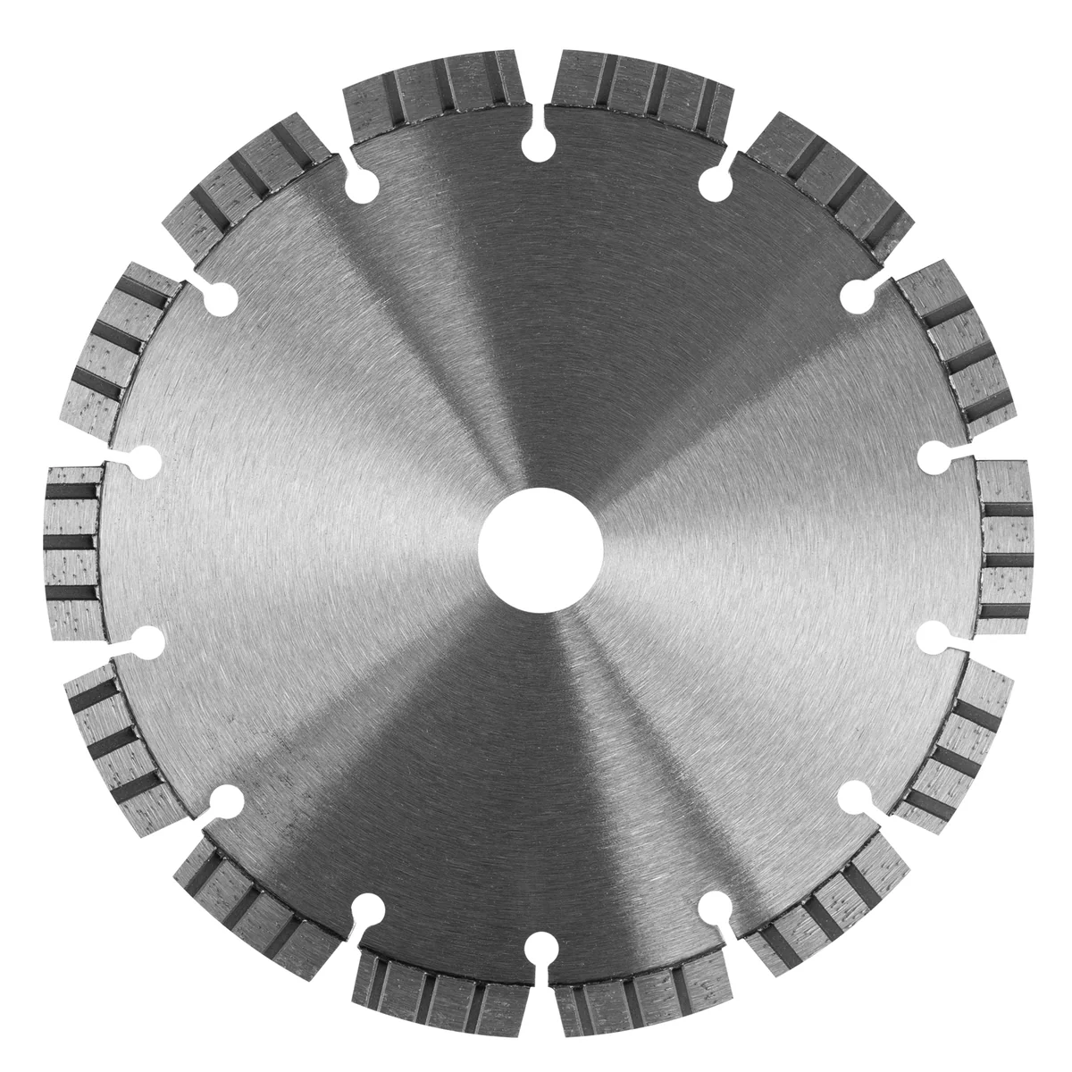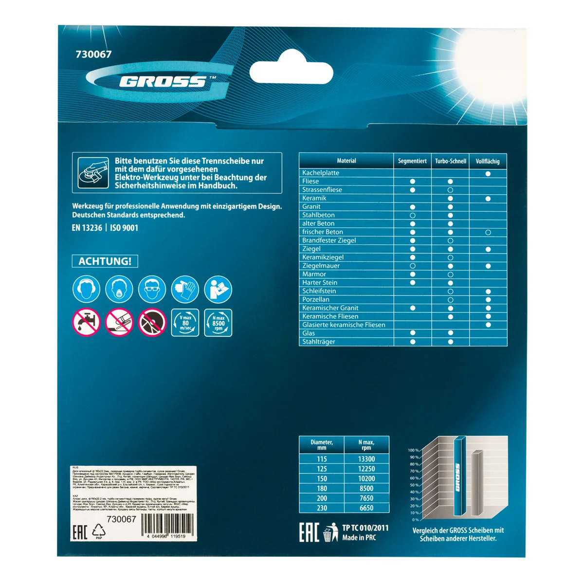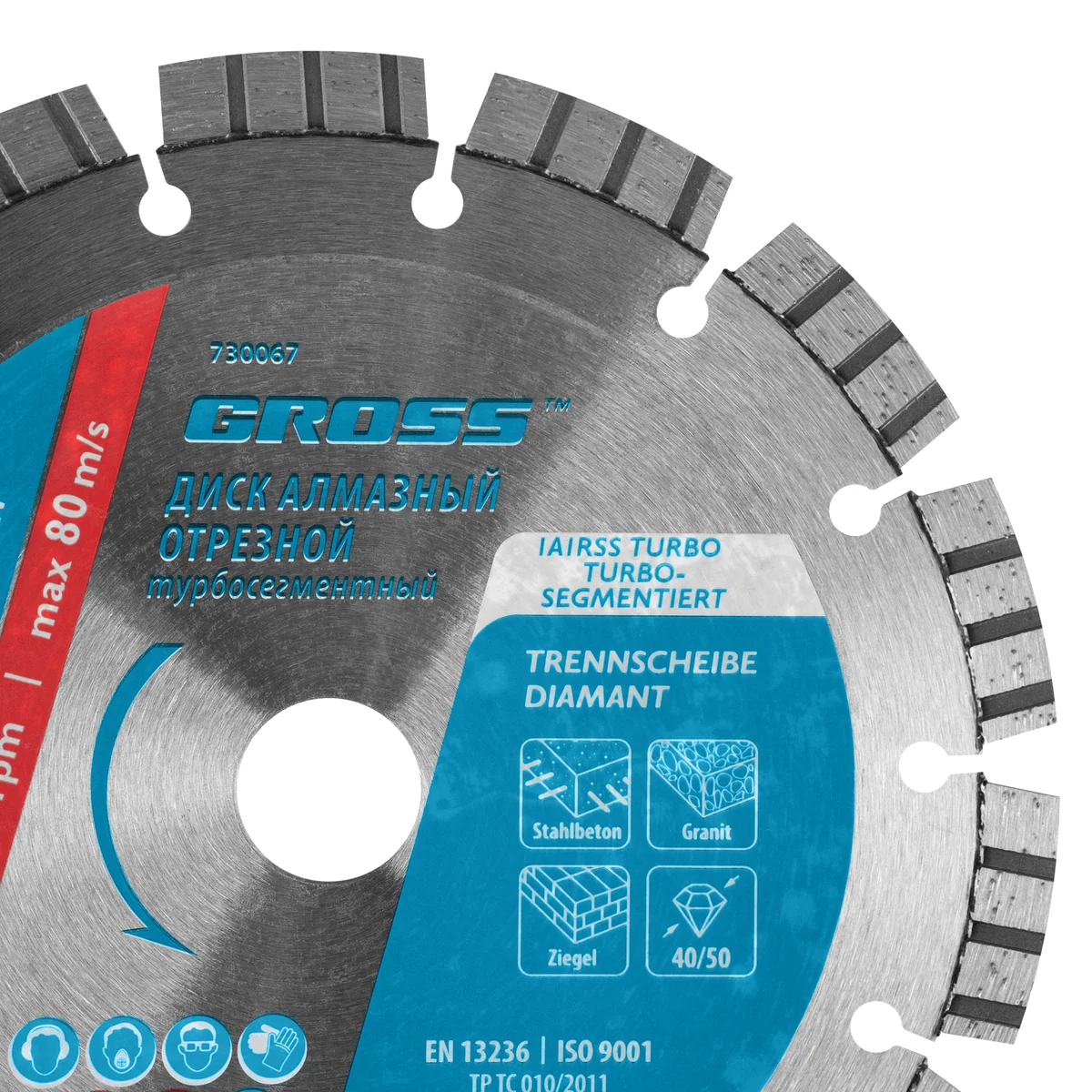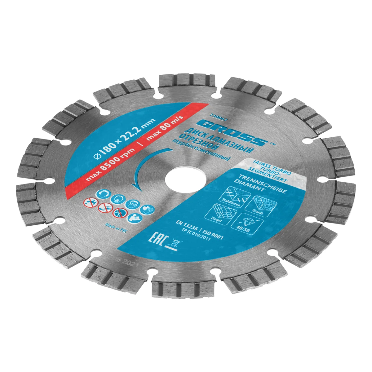 Алмазный диск Gross ф180х22,2 мм 730067 с лазерной приваркой турбо-сегментов предназначен для сухого резания бетона, в том числе свежего, слабоармированного железобетона, кирпича, песчаника и гранита. Посадочный диаметр 22,2 мм позволяет использовать диск в качестве расходного инструмента для УШМ. Турбо-сегменты обеспечивают быстрое сухое резание без необходимости водяного охлаждения. За счет оптимально подобранной связки диск выдерживает перегрузки и подходит как для интенсивного бытового, так и для профессионального применения, когда требуется выполнить большой объем работ.ПреимуществаТурбо-сегментная форма — диск универсален по своему применению, позволяет быстро резать материалы, в т.ч. слабоармированный бетон без риска деформации.Лазерная приварка турбо-сегментов — режущий алмазный слой прочно фиксируются на корпусе, такая технология изготовления гарантирует надежность диска и высокую стойкость к нагрузкам.Ширина алмазного слоя 10 мм — диск гарантирует высокую производительность выполняемых работ.Высокая концентрация алмазов — режущая часть обеспечивает эффективность и большую скорость реза, т.к. изготовлена из качественных крупных зерен размером 40-50 мкм.Корпус из стали 65Mn — диск хорошо пружинит и сохраняет плоскостность в процессе реза, что увеличивает срок службы инструмента.Превосходное качество — диск изготовлен на высококлассном корейском оборудовании.Высокий рабочий ресурс — серебро, кобальт и другие дорогостоящие компоненты в составе металлической связки надежно удерживают алмазные зерна и обеспечивают равномерный износ и своевременное вскрытие на кромке новых алмазов.Защитно-декоративное покрытие — бесцветный лак повышает коррозионную стойкость инструмента.