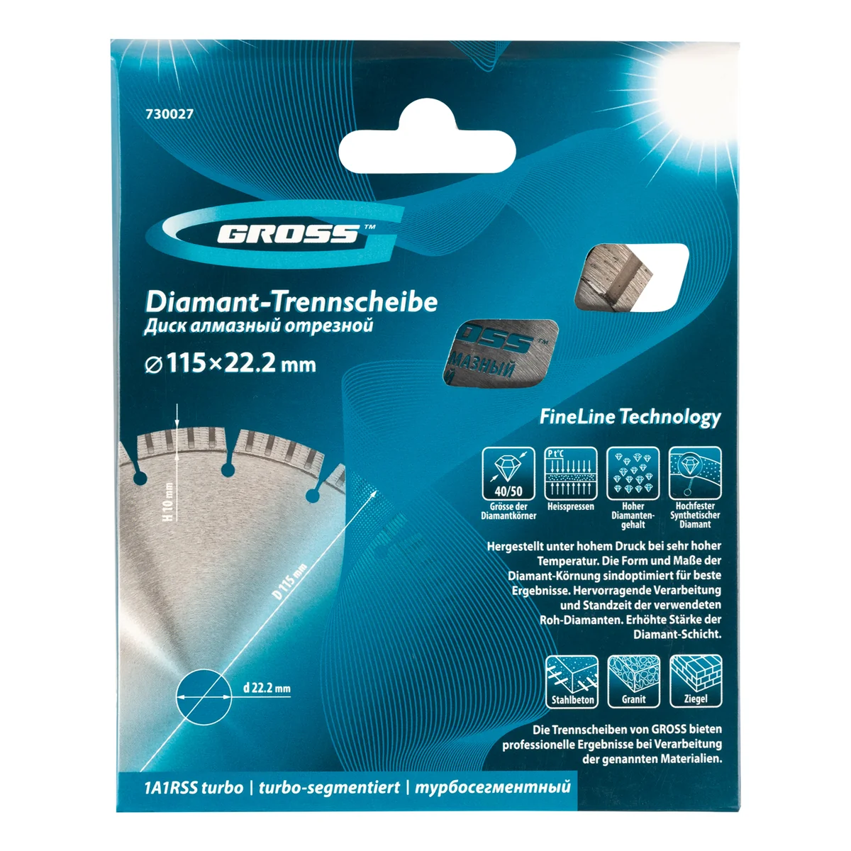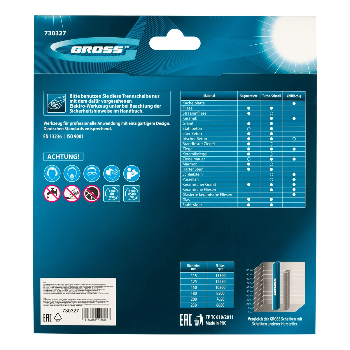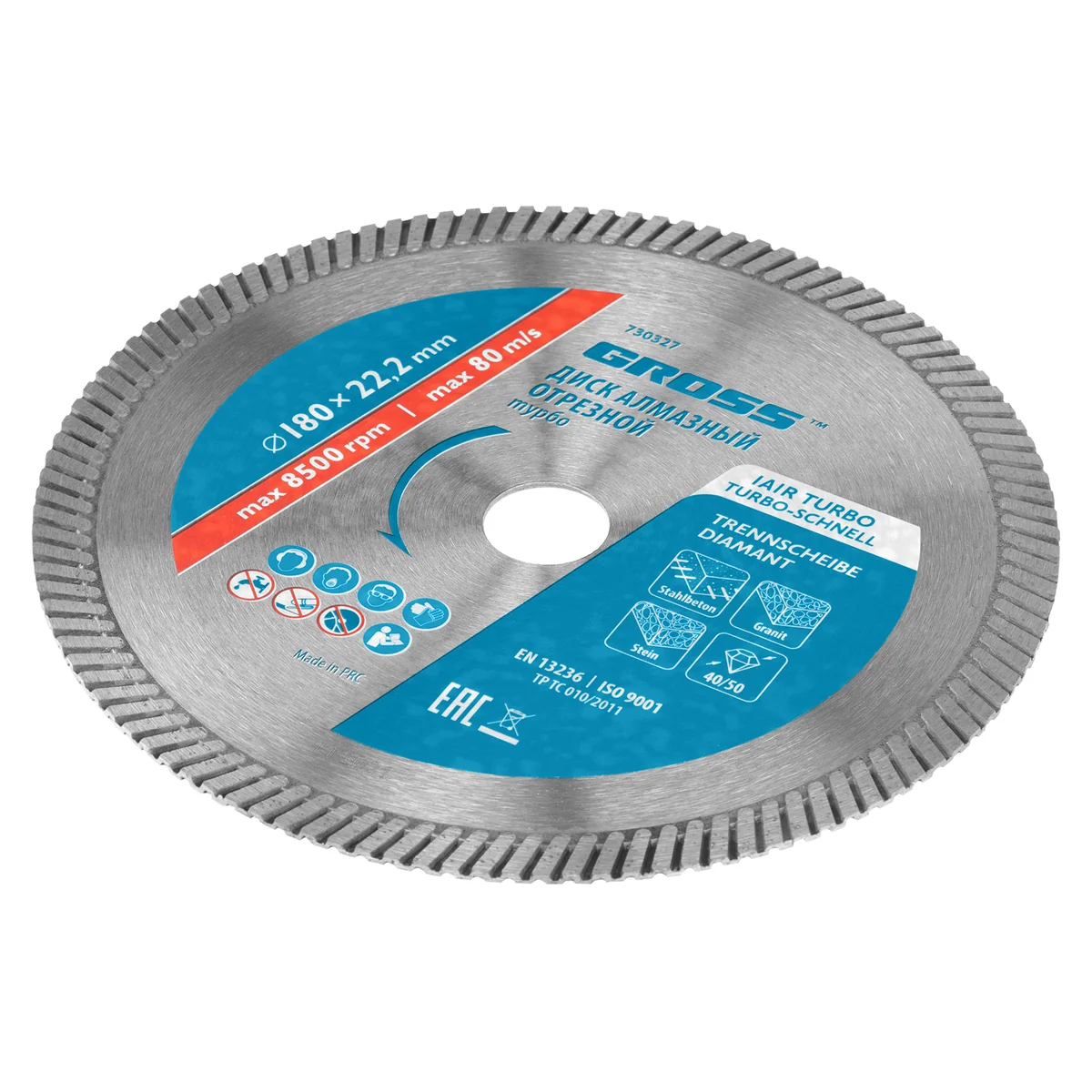 Алмазный диск Gross ф180х22,2мм 730327, турбо, позволяет осуществлять сухое резание бетона, в том числе недавно уложенного, среднеармированного железобетона, кирпича, гранита, камня, песчаника с помощью УШМ. Инструмент подходит для алмазной резки нескольких типов материалов благодаря турбированной рабочей части и оптимальному соотношению компонентов в металлической связке. Высокое качество диска делает его подходящим для профессионального применения.ПреимуществаТурбированная форма обеспечивает быструю алмазную резку сухим способом, прибегать к водяному охлаждению не нужно.Изготовление диска путем горячего прессования позволяет повысить его надежность и ресурс.Алмазный диск быстро режет материалы и отличается износостойкостью благодаря высокой концентрации алмазов и крупному размеру зерен 40-50 мкм.Широкая рабочая часть (10 мм) позволяет повысить производительность работ.Высококачественная связка из серебра, кобальта и других компонентов со временем истирается, раскрывая новый слой алмазов, поэтому диск рассчитан на долгую службу.Корпус диска выполнено из углеродистой стали 65Mn с добавлением марганца, который помогает улучшить пружинные свойства и защитить диск от искривления в процессе реза.Корпус имеет защитно-декоративное лаковое покрытие, поэтому не подвержен образованию коррозии.