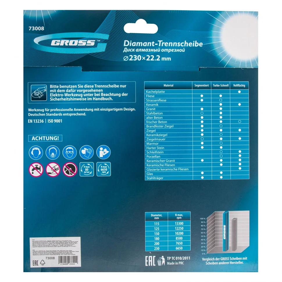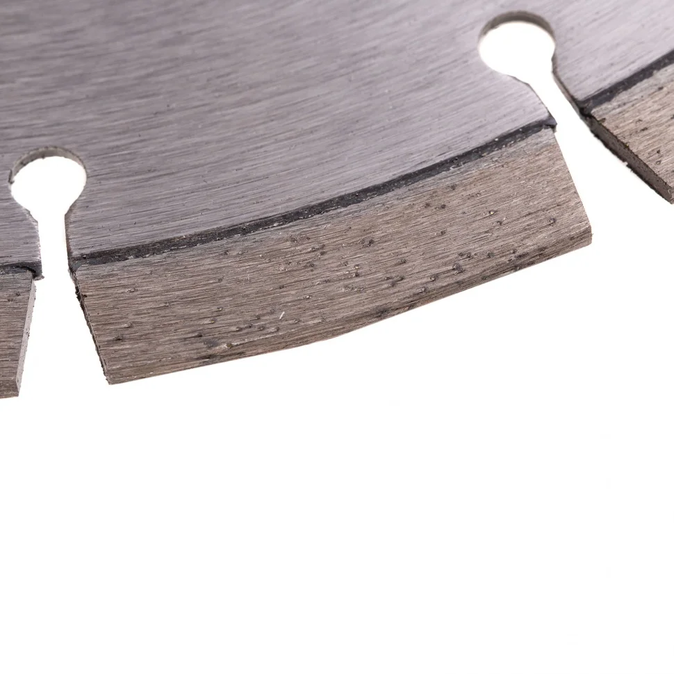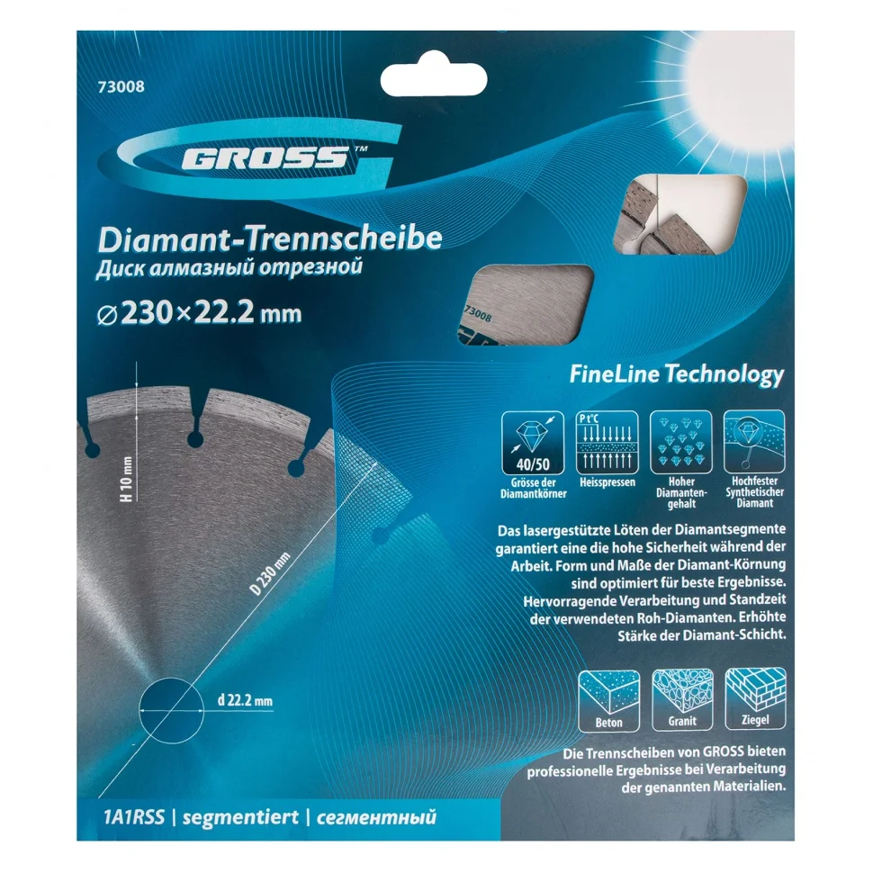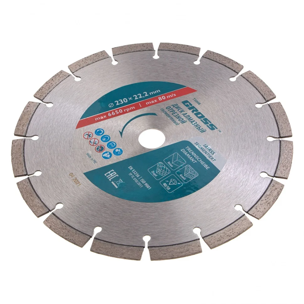 Алмазный диск Gross ф230 х 22,2 мм 73008 с лазерной приваркой сегментов предназначен для сухого резания бетона, в том числе свежего, кирпича, песчаника и гранита. Посадочный диаметр 22,2 мм позволяет использовать диск в качестве расходного инструмента для УШМ. Сегменты обеспечивают быстрое сухое резание без необходимости водяного охлаждения. За счет оптимально подобранной связки диск выдерживает перегрузки и подходит как для интенсивного бытового, так и для профессионального применения, когда требуется выполнить большой объем работ.Преимущества Сегментная форма — 16 прорезей в режущем слое способствуют небольшому изменению размера секторов диска в процессе сухого резания, что позволяет защитить его от деформации. Лазерная приварка сегментов — режущий алмазный слой прочно зафиксирован на корпусе, такая технология изготовления гарантирует надежность диска и высокую стойкость к нагрузкам. Ширина алмазного слоя 10 мм — диск гарантирует высокую производительность выполняемых работ. Высокая концентрация алмазов — режущая часть обеспечивает эффективность и большую скорость реза, т.к. изготовлена из качественных крупных зерен размером 40-50 мкм. Корпус из стали 65Mn — диск хорошо пружинит и сохраняет плоскостность в процессе реза, что увеличивает срок службы инструмента. Превосходное качество — диск изготовлен на высококлассном корейском оборудовании. Высокий рабочий ресурс — серебро, кобальт и другие дорогостоящие компоненты в составе металлической связки надежно удерживают алмазные зерна и обеспечивают равномерный износ и своевременное вскрытие на кромке новых алмазов. Защитно-декоративное покрытие — бесцветный лак повышает коррозионную стойкость инструмента.