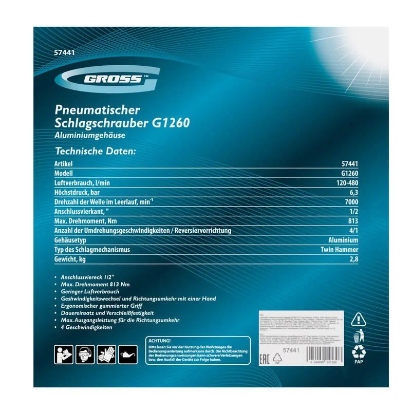 Гайковерт пневматический ударный G1260,1/2, Twin Hammer, 813Нм, 7000 об/мин Gross 57441