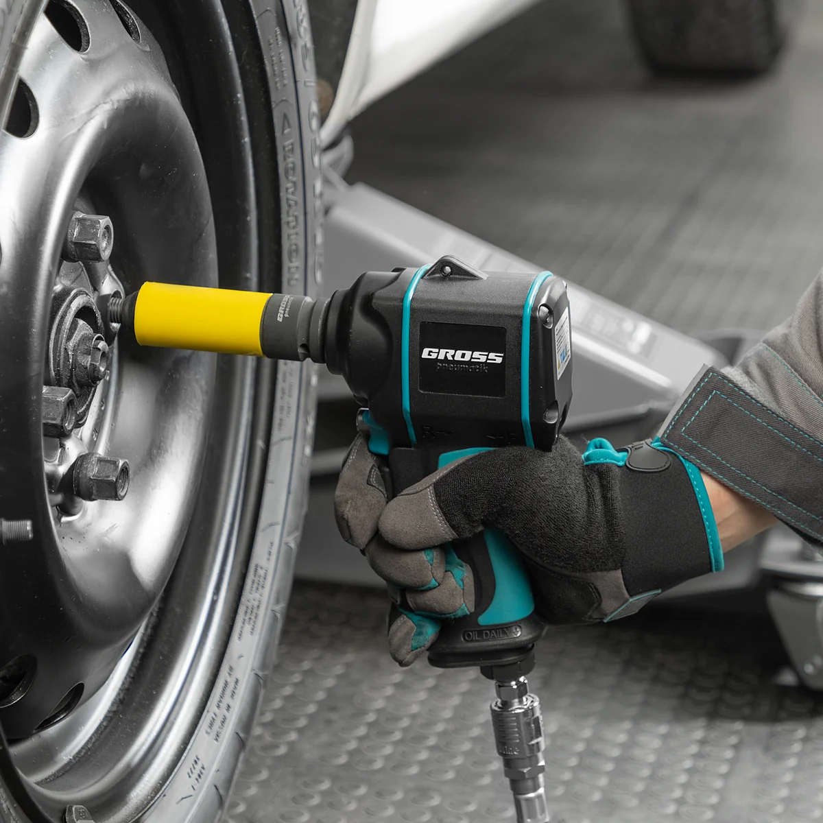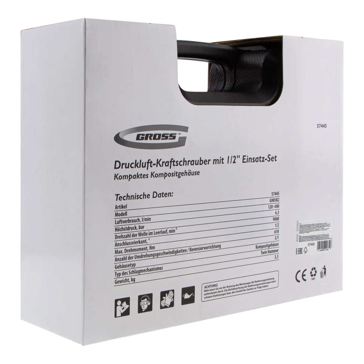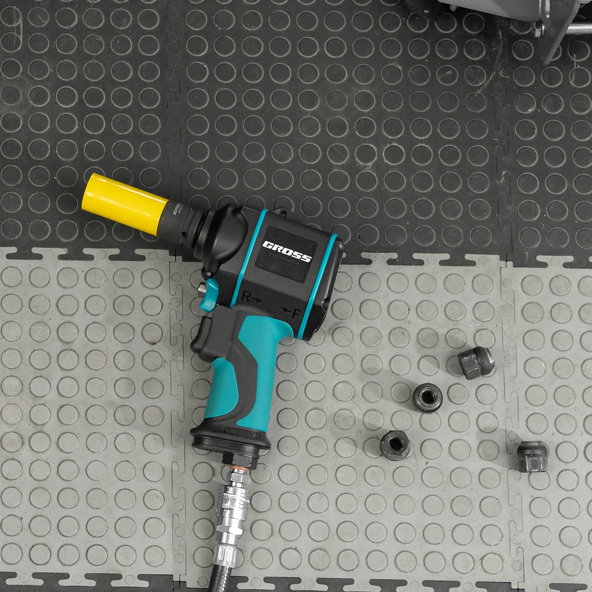 Пневматический ударный гайковерт Gross G985K2 57445 с максимальным крутящим моментом 610 Нм и присоединительным квадратом 1/2″, с частотой вращения шпинделя 9000 об/мин, входит в набор из 17 предметов и упрощает закручивание/раскручивание резьбовых высоконагруженных соединений на винтах, болтах и гайках. Для него подойдет маломощный компрессор, т.к. инструмент расходует небольшое количество воздуха от 120 л/мин. Гайковерт применяется как в быту, так и в профессиональной сфере — в гараже, сборочном цехе, автосервисе, на строительной площадке.