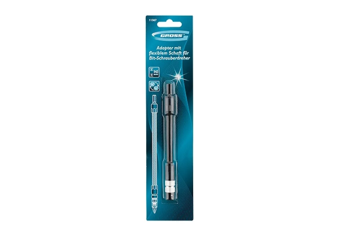 Гибкий адаптер-удлинитель Gross 11367 выполнен из инструментальной стали и размещен в тонком полупрозрачном блистере. Для большей стойкости к коррозии и другим негативным воздействиям изделие покрыто хромированием. Успешно эксплуатировать его можно не только с механизированным, но и с ручным инструментом, например, с отверткой со сменными насадками.