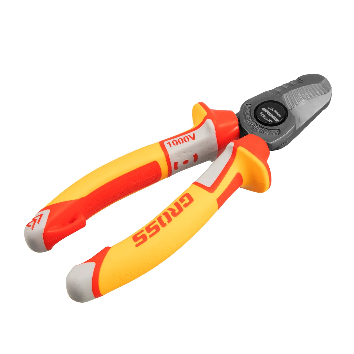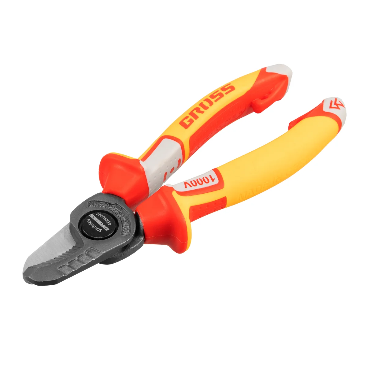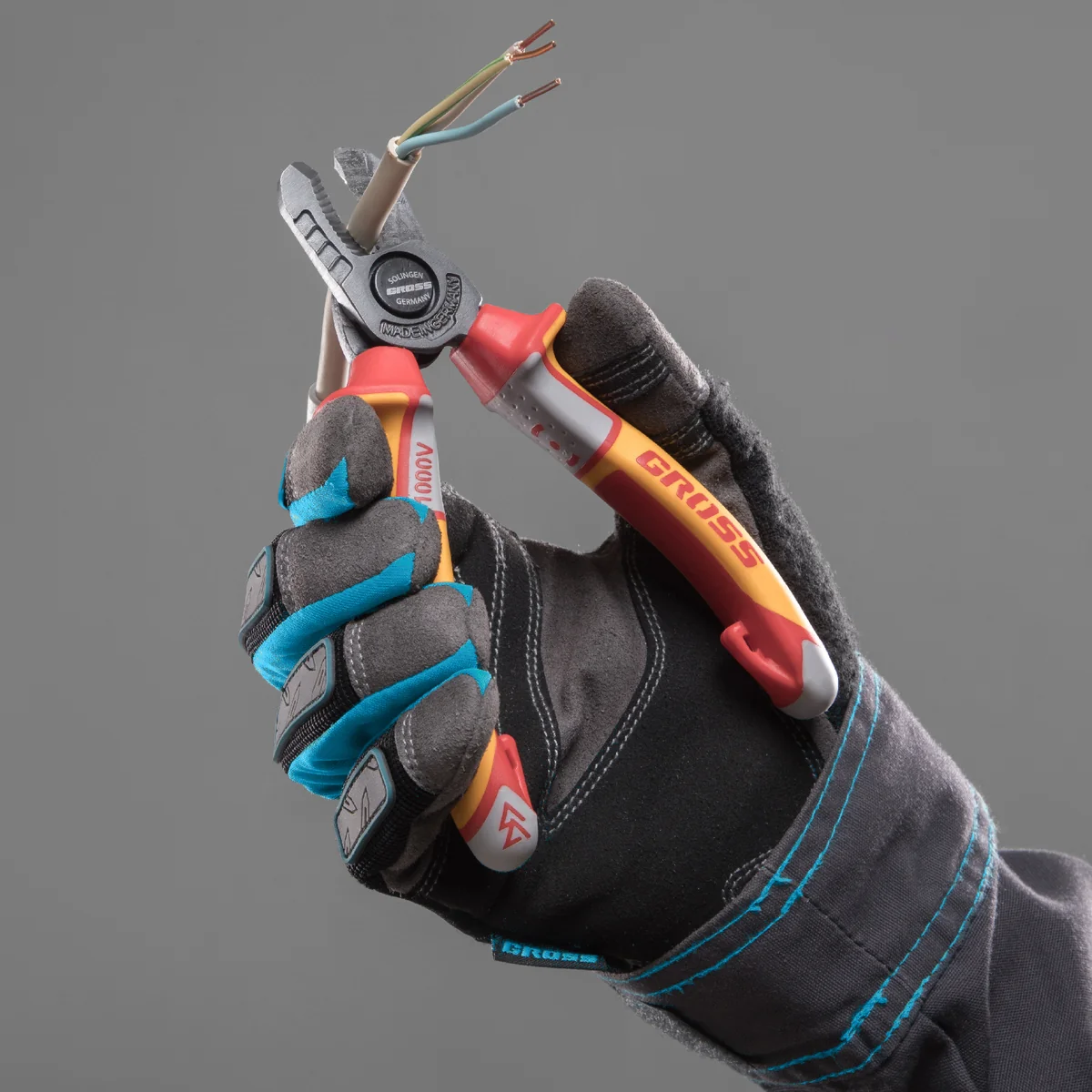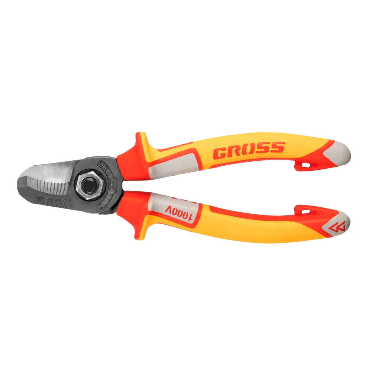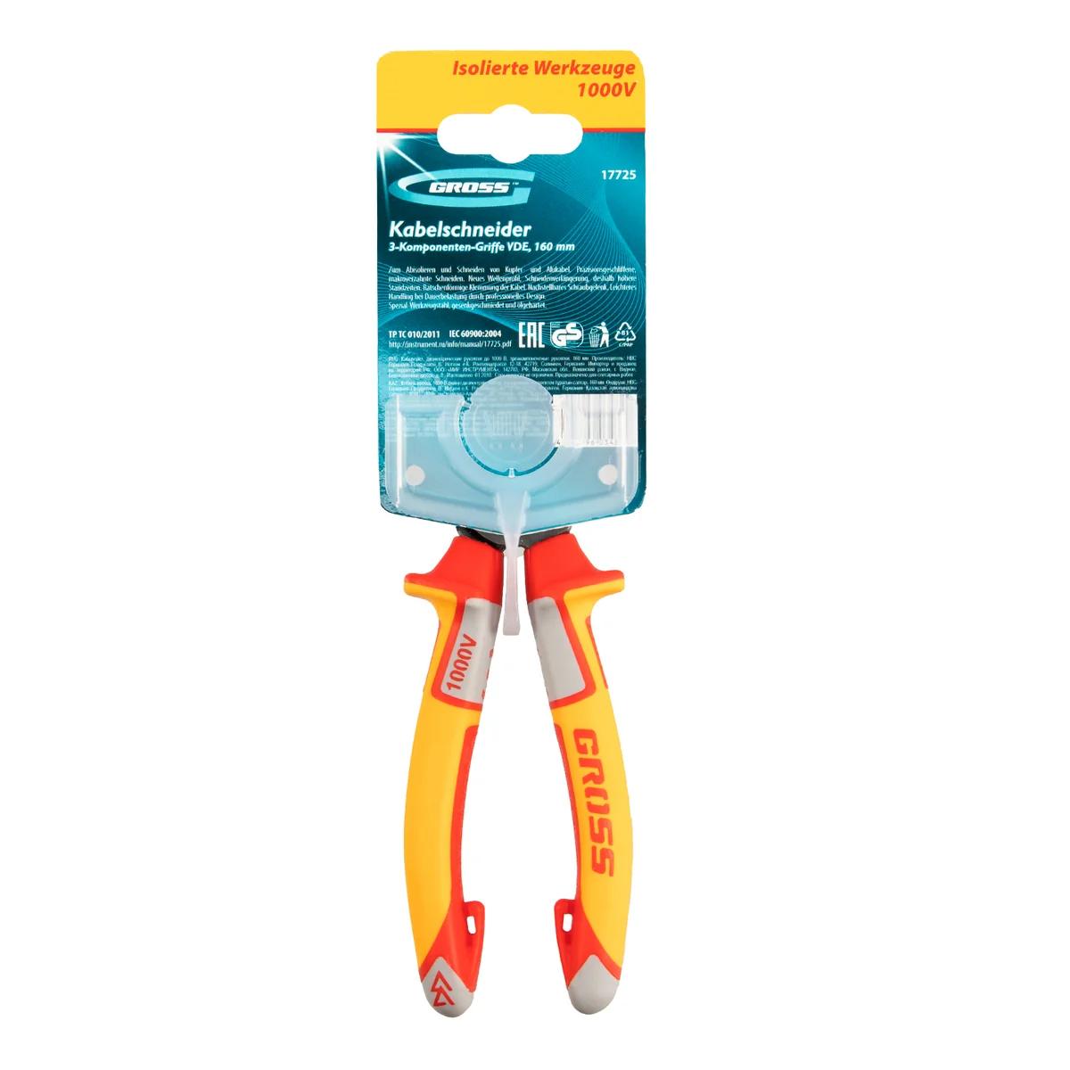 Кабелерез Gross 17725 длиной 160 мм, с трехкомпонентными диэлектрическими рукоятками до 1000 В, широко используется при проведении слесарных и электромонтажных работ. С его помощью можно перерезать многопроволочную жилу из меди и алюминия, снять изоляцию с электропроводов. Инструмент не подходит для работы с алюминиевыми сплавами, стальной проволокой и холоднотянутыми медными проводами, может использоваться только для многопроволочных жил (общий диаметр кабеля не более 16 мм, сечение до 50 кв. мм). Важно — техника безопасности не допускает выполнения работ под напряжением.Преимущества Рабочая часть из стали С60 отличается высокой прочностью и износостойкостью. Покрытие Titan Finish предотвращает появление коррозии на губках, продлевая срок службы инструмента. Режущие кромки с закругленным профилем не допускают выскальзывания кабеля, что повышает эффективность работы. Трехкомпонентные рукоятки эргономичной формы надежно ложатся в руку и снижают нагрузку на кисть. Благодаря широким упорам на рукоятках пальцы не соскальзывают на рабочую часть. 5-летняя гарантия на заводской брак подтверждает высокое качество кабелереза.