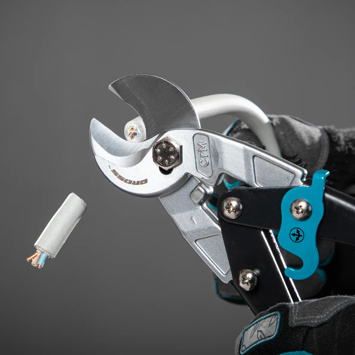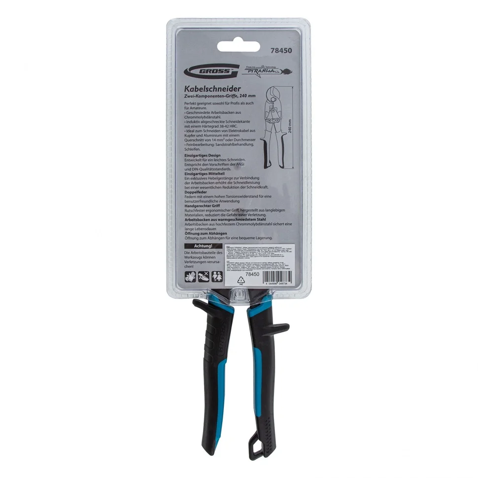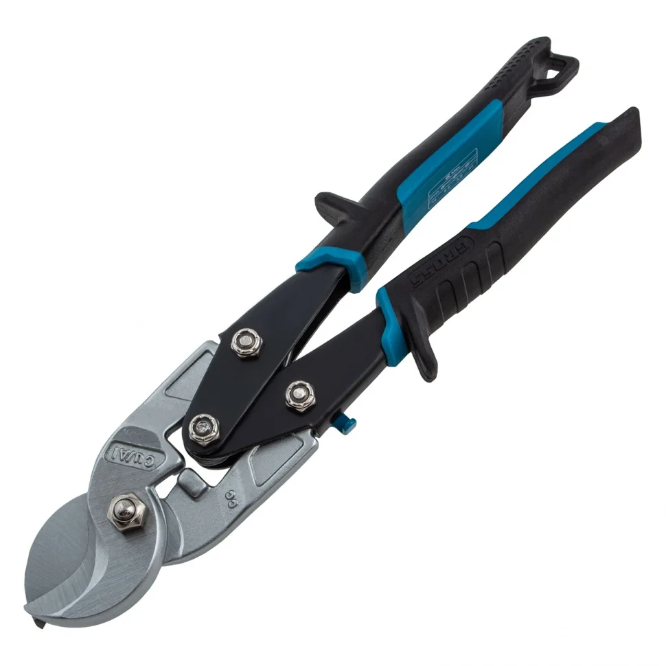 Кабелерез Gross «PIRANHA» 78450 длиной 240 мм, с двухкомпонентными рукоятками, используется для перерезания одножильных и многожильных кабелей диаметром до 14 мм и сечением до 14 кв. мм. Он пригодится частным мастерам и профессионалам при выполнении электромонтажных работ.Преимущества Рабочая часть выполнена из хромомолибденовой стали и отличается высокой прочностью. Режущие кромки закалены индукционными токами до твердости 60-62 HRC, что увеличивает их рабочий ресурс. Двойной рычажный механизм позволяет добиться высокой силы сжатия и сэкономить до 20% усилий при перерезании как алюминиевых, так и медных кабелей. Двухкомпонентные рукоятки с защитными упорами предотвращают соскальзывание ладони на металлические части. Специальное ушко для подвеса позволяет закрепить кабелерез на поясе или крючке.