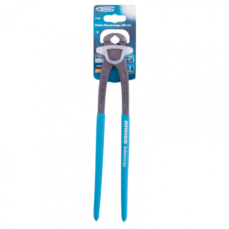 Торцевые клещи Gross 17993 длиной 280 мм, с обливными рукоятками, будут полезны при проведении строительных, монтажных, ремонтных работ. С их помощью можно вытягивать гвозди и шпильки, сгибать и перекусывать стальную проволоку, прутки и т.д. Инструмент пригодится частным мастерам и профессионалам.ПреимуществаДолговечность клещей обеспечивает конструкционная сталь С1050, из которой они изготовлены.Высокую прочность клещам придает дополнительная закалка режущих кромок индукционными токами высокой частоты.Антикоррозийное покрытие Titan finish позволяет предотвратить образование коррозии.Обливные рукоятки с прорезиненным покрытием гарантируют комфорт и безопасность работы, т.к. практически полностью гасят вибрации и не проскальзывают в ладони.Производитель установил гарантию на заводской брак сроком на 5 лет, что подтверждает высокое качество клещей.