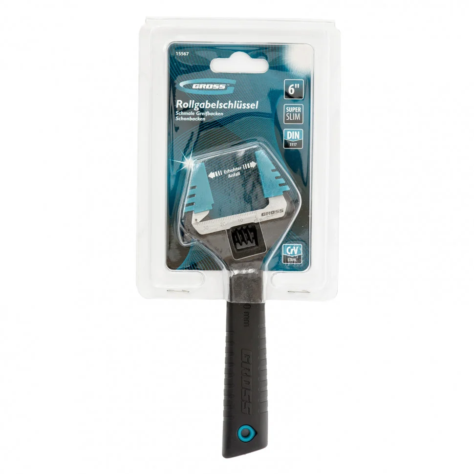 Разводной ключ Gross 15567 длиной 150 мм, с тонкими губками и защитными насадками, позволяет регулировать ширину раскрытия зева на 30% больше, чем у стандартных моделей. Инструмент оптимально подходит для монтажа и демонтажа крепежных элементов диаметром до 35 мм. Имеет широкую область применения: сантехнические работы, мелкий бытовой ремонт, полупрофессиональное применение и т.д. Тонкие губки легко проникают в труднодоступные места.ПреимуществаКлюч изготовлен из хромованадиевой стали, что придает ему повышенную износостойкость, прочность и надежность.Фосфатное покрытие не допускает появления коррозии на поверхности инструмента.Защитные насадки в комплекте снижают риск деформации хромированных деталей.Метрическая линейка на ключе помогает выставить нужный размах зева.Рукоятка эргономичной формы обеспечивает надежный хват и комфортную работу, позволяет прикладывать больше усилий для откручивания и закручивания деталей.Благодаря облегченному корпусу с ключом удобно работать даже длительное время.На рукоятке предусмотрено отверстие для подвесного хранения ключа.