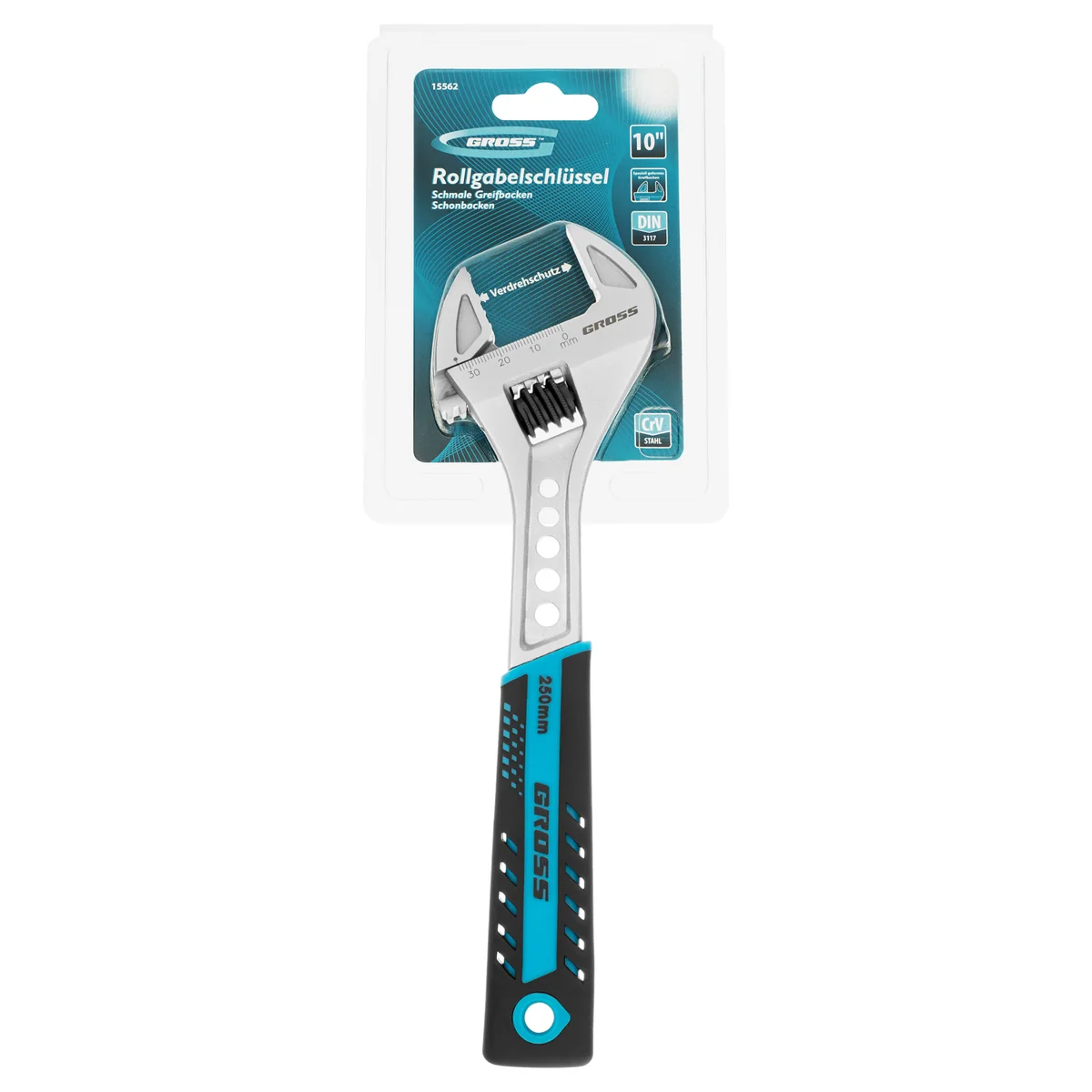 Разводной ключ Gross 15562 длиной 250 мм, из стали CrV, с двухкомпонентной рукояткой, обеспечивает эффективный монтаж и демонтаж крепежных элементов. Губки со специальными насечками надежно захватывают детали и не допускают их проскальзывания. Диапазон раскрытия губок до 35 мм позволяет работать с деталями разного размера и формы.ПреимуществаХромованадиевая сталь, из которой изготовлен ключ, обладает рядом преимуществ: прочность, жесткость и износостойкость.Хромированное покрытие обеспечивает устойчивость инструмента к образованию коррозии.Двухкомпонентная обрезиненная рукоятка эргономичной формы надежно лежит в руке и не проскальзывает в процессе работы.За счет облегченного корпусу ключа снижается нагрузка на руки мастера.
