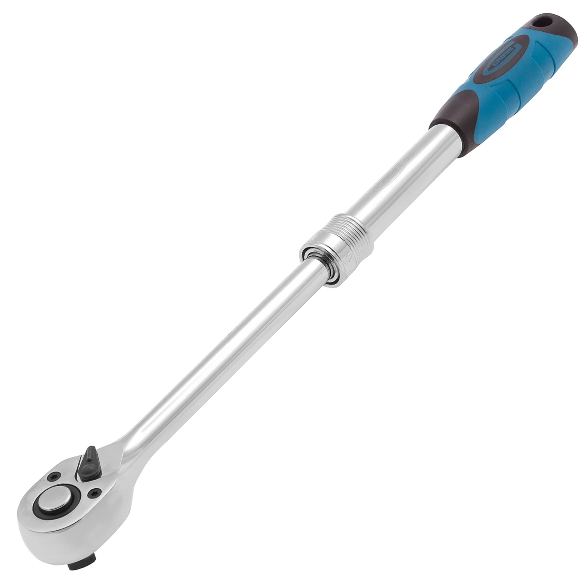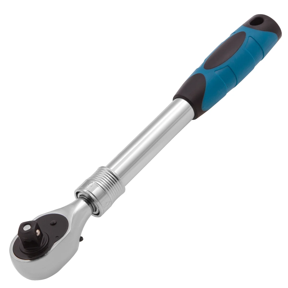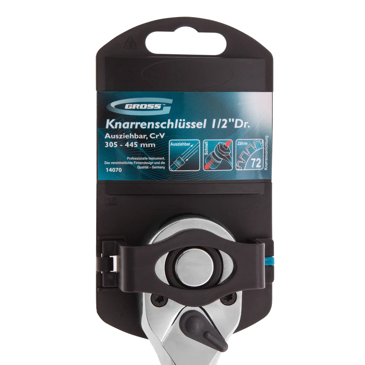 Телескопический хромированный трещоточный ключ Gross 14070, 305-445 мм, из стали CrV, с присоединительным квадратом 1/2 дюйма и 2-компонентной рукояткой, предназначен для монтажных работ с резьбовыми соединениями. Особенно удобен для работы в труднодоступных местах, т.к. имеет запатентованный механизм фиксации телескопической рукоятки. Ее длину можно изменить с 305 до 445 мм. Инструмент используется в слесарных мастерских, автосервисах, пригодится и в быту.ПреимуществаВысокая износостойкость — ключ-трещотка изготовлен из прочной стали хромованадиевой группы.Долговечность — хромированная поверхность устойчива к ржавчине и воздействию агрессивных веществ.Расширенные возможности — реверсивный механизм позволяет использовать инструмент как для закручивания, так и для откручивания крепежей.Легкая замена оснастки — кнопка быстрого сброса упрощает съем и установку насадок.Высокая плавность работы — храповый механизм с 72 зубцами имеет шаг 5 градусов.Надежная фиксация насадки — благодаря присоединительному квадрату с шариком оснастка не соскакивает во время работы.Комфортная эксплуатация — удобная двухкомпонентная ручка надежно ложится в руку и не выскальзывает из ладони.