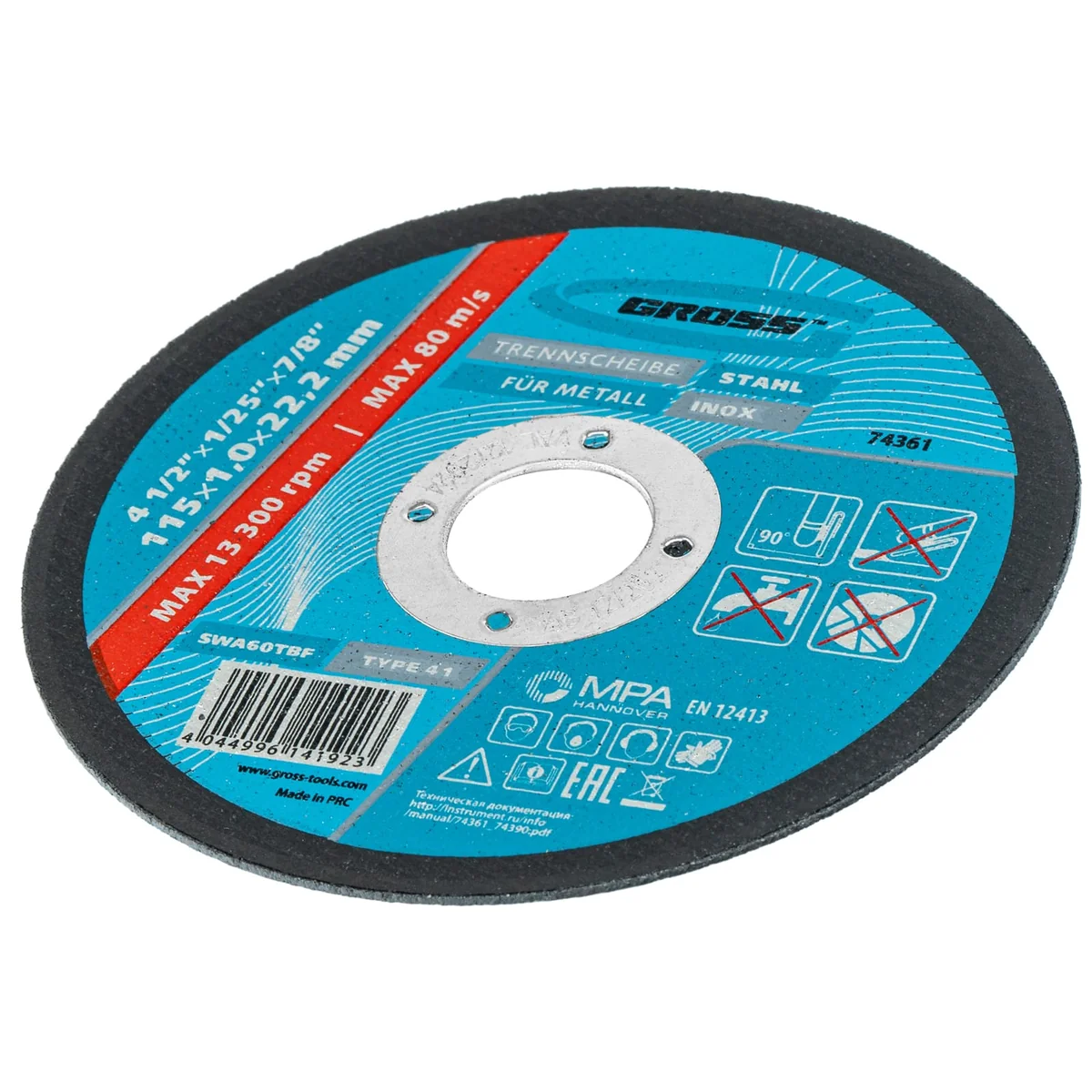Отрезной круг по металлу Gross SWA60TBF 74361, 115 х 1,0 х 22,2 мм, рассчитан на интенсивный сухой рез нержавеющих легированных и углеродистых сталей. Устанавливается на УШМ соответствующего типоразмера. Надежный и производительный, круг подходит для профессиональной эксплуатации с высокими нагрузками.ПреимуществаАбразив из монокорунда с добавками - зерно обладает высокой твердостью и прочностью, подтачивается в процессе работы, поэтому эффективность реза не снижается.Очень высокий ресурс - в бакелитовую связку и абразив включены специальные добавки.Безопасность работы - высококачественная двухслойная стеклосетка защищает круг от перегрузок, предотвращая его разлет в случае зажатия в материале.Специальный состав - круг слабо нагревается в процессе реза, износ происходит медленно и равномерно, поэтому образуется минимальное количество пыли и искр.Толщина 1 мм и крупный абразив F60 - круг обеспечивает высокую скорость и точность реза.Плотная равномерная структура - круг прошел дополнительное тестирование на дисбаланс, это обеспечивает стабильность и точность работы.Проверенное качество - круг прошел контроль на всех этапах производства, что подтверждено ганноверским и российским сертификатами безопасности.