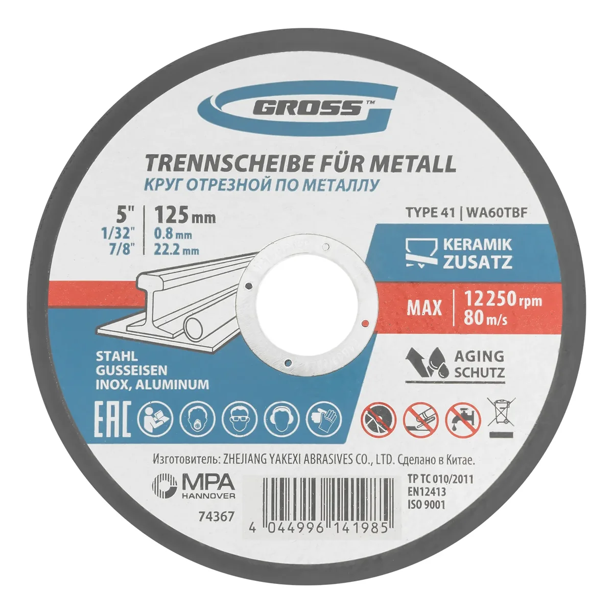 Отрезной круг по металлу Gross WA60TBF 74367 диаметром 125 мм и толщиной 0,8 мм устанавливается на фланец углошлифовальной машины с посадочным размером 22,2 мм. Рассчитан на интенсивный сухой рез углеродистых и нержавеющих легированных сталей, алюминия, чугуна. Рекомендованная максимальная частота вращения составляет 12250 об/мин. Круг выдерживает высокие нагрузки, подходит для профессиональной эксплуатации с высокими нагрузками.