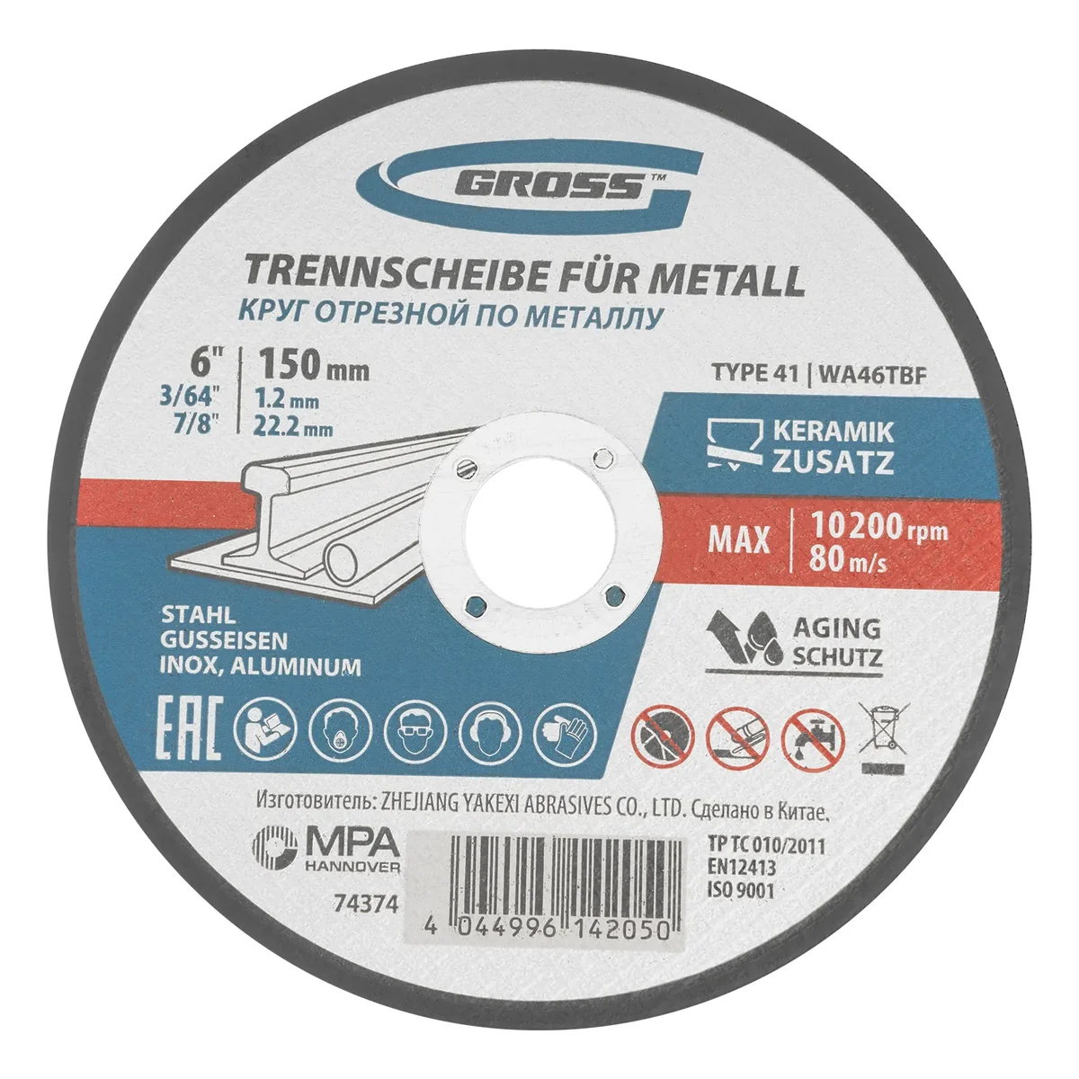 Отрезной круг по металлу Gross WA46TBF 74374 диаметром 150 мм и толщиной 1,2 мм устанавливается на фланец углошлифовальной машины с посадочным размером 22,2 мм. Рассчитан на интенсивный сухой рез углеродистых и нержавеющих легированных сталей, алюминия, чугуна. Рекомендованная максимальная частота вращения составляет 10200 об/мин. Круг выдерживает высокие нагрузки, подходит для профессиональной эксплуатации с высокими нагрузками.