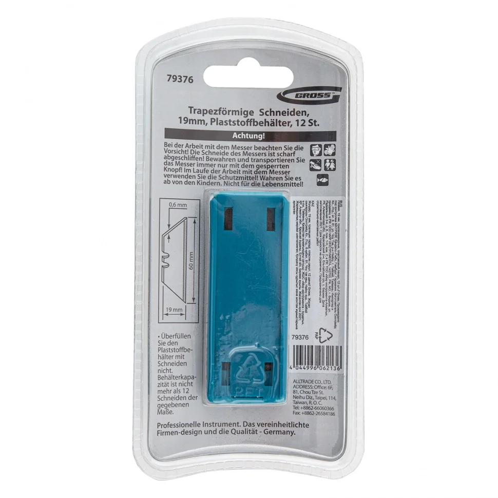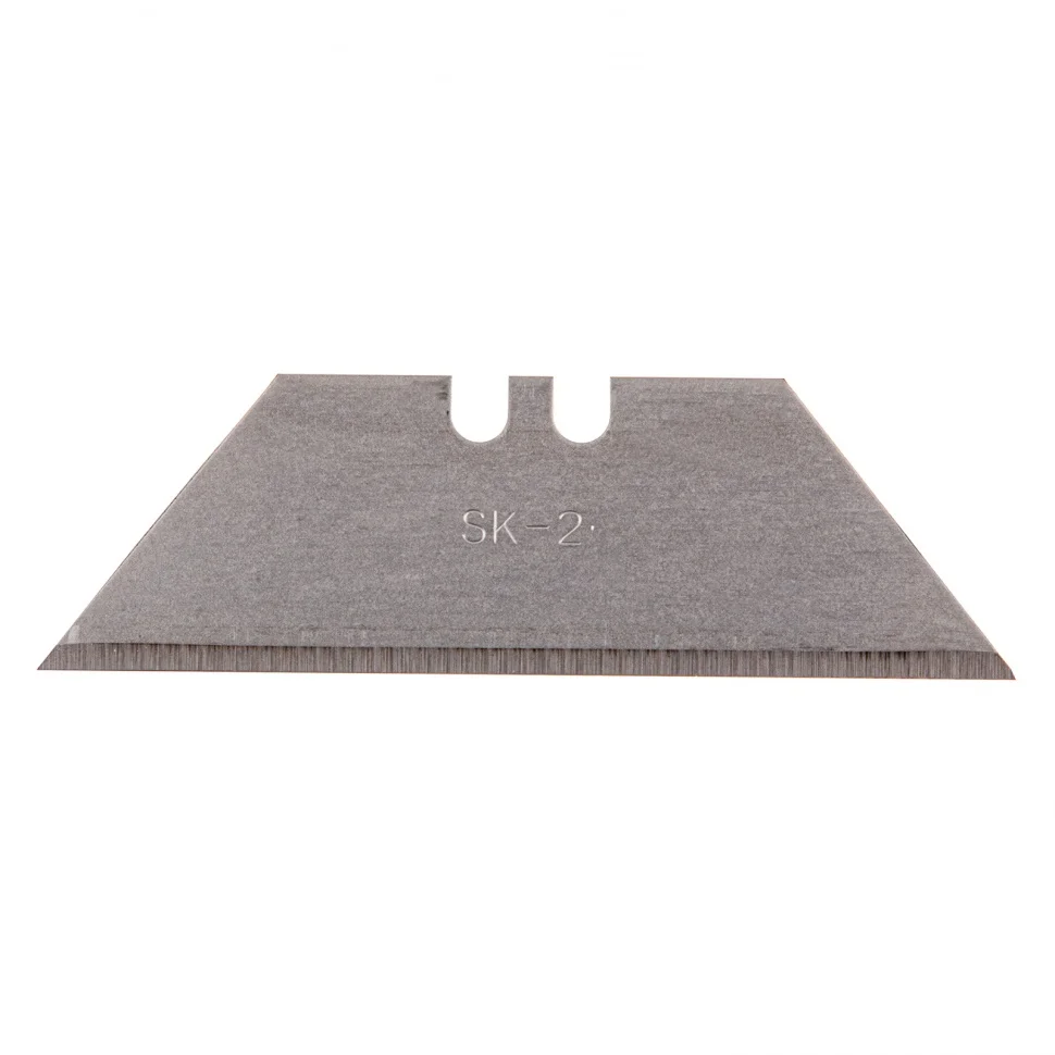 Трапециевидные лезвия Gross 79376 шириной 19 мм и длиной 61 мм, 12 шт. в пластиковом пенале, — сменные элементы для монтажных ножей Gross соответствующего типоразмера, кроме арт. 78873 и 78885. Они предназначены для резки бумаги, картона, кожи, линолеума. Пригодятся во время ремонта, отделочных работ, а также могут использоваться для творчества.ПреимуществаЛезвия изготовлены из высокоуглеродистой японской стали SK-2 толщиной 0,5 мм, поэтому долго сохраняют режущую способность.Закаленные до твердости 58-62 HRC, лезвия обладают высокой стойкостью к износу.Запасные полотна упакованы в пластиковый пенал с прозрачной крышкой, поэтому их удобно хранить и переносить.Простая система извлечения позволяет достать расходник из пенала за несколько секунд — достаточно слегка нажать на крышку и сдвинуть ее вперед.Набора из 12 остро заточенных лезвий хватит надолго.