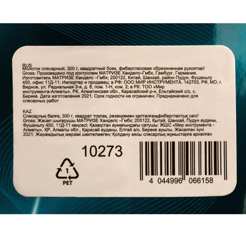 Молоток слесарный, 300 г, квадратный боек, фибергласовая обрезиненная рукоятка Gross 10273