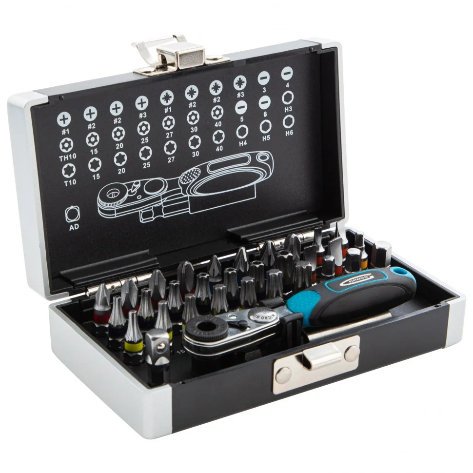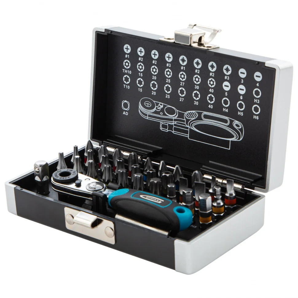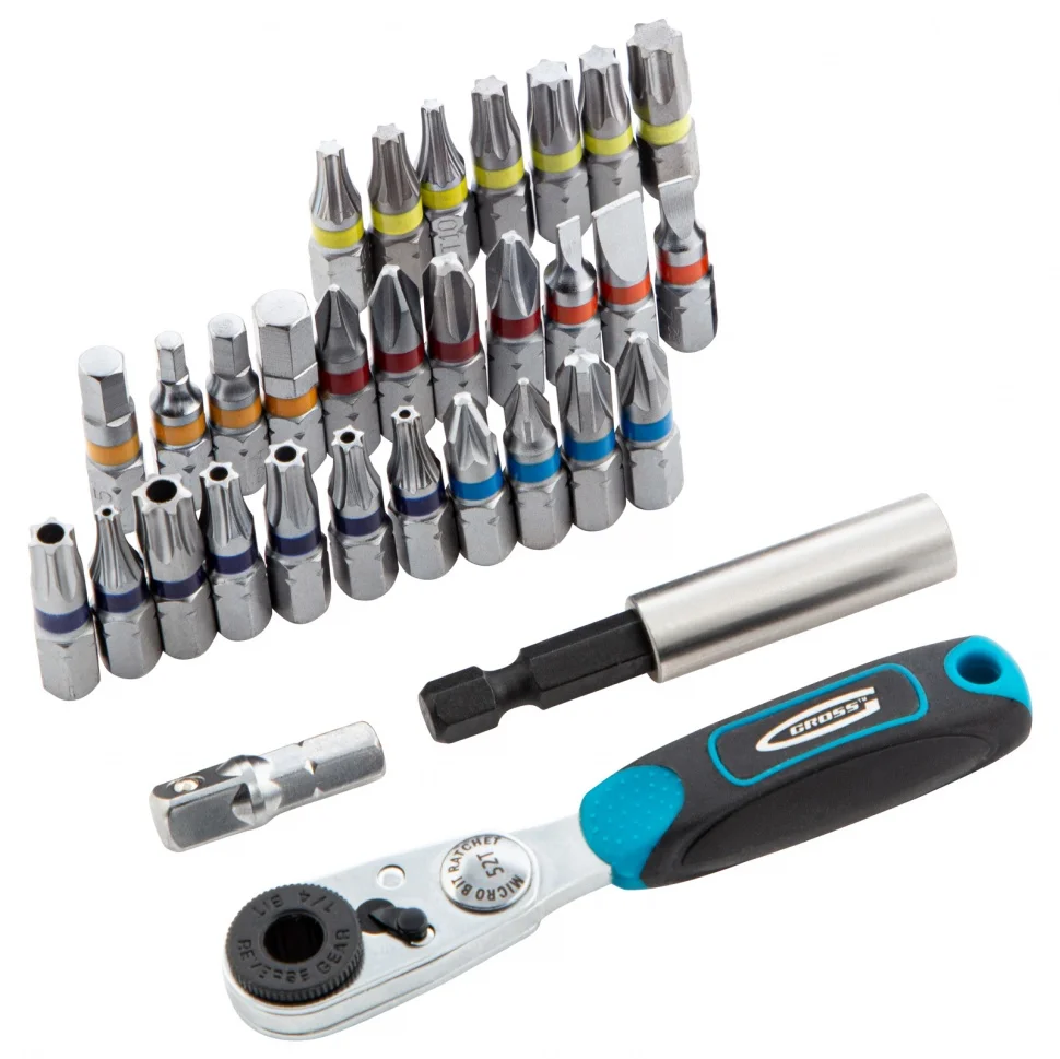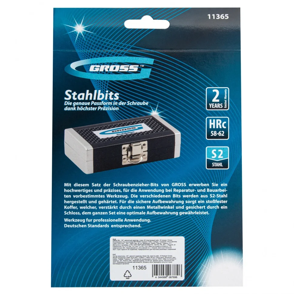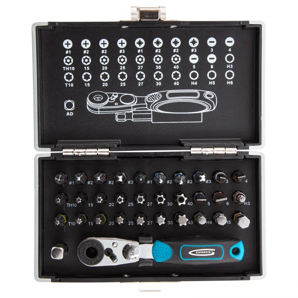 Набор бит с магнитным держателем Gross 11365 с присоединительным размером 1/4 дюйма, 33 предмета из стали S2 в пластиковом кейсе, предназначен для сборки мебели, велосипедов, бытовых приборов, для технического обслуживания автомобилей и прочих монтажных, строительных и слесарных работ. В комплекте подобраны 30 бит самых ходовых типоразмеров, компактный ключ-трещотка с 52 зубьями, магнитный адаптер для бит, а также переходник для использования торцевых головок.ПреимуществаШирокая комплектация — набор включает биты PH 1-3, PZ 1-3, Sl 3-6, TORX и TORX Tamper 10, 15, 20, 25, 27, 30, 40, HEX 3-6.Долгий срок службы — биты из японской легированной стали S2 обладают повышенной прочностью и износостойкостью.Эффективная работа даже в труднодоступных местах — адаптер для бит с исключает риск их выпадения благодаря встроенному магниту, а переходник с шариком-фиксатором обеспечивает надежное крепление торцевой головки.Функция реверса — быстрая смена направления вращения позволяет не только монтировать, но и демонтировать резьбовые соединения.Комфортная работа — двухкомпонентная рукоятка трещотки удобно ложится в руку и не проскальзывает в ладони.Бережное хранение и транспортировка — набор поставляется в ударопрочном кейсе с замком-защелкойБыстрый подбор нужной насадки — на крышке кейса напечатана схема комплекта по типоразмерам.