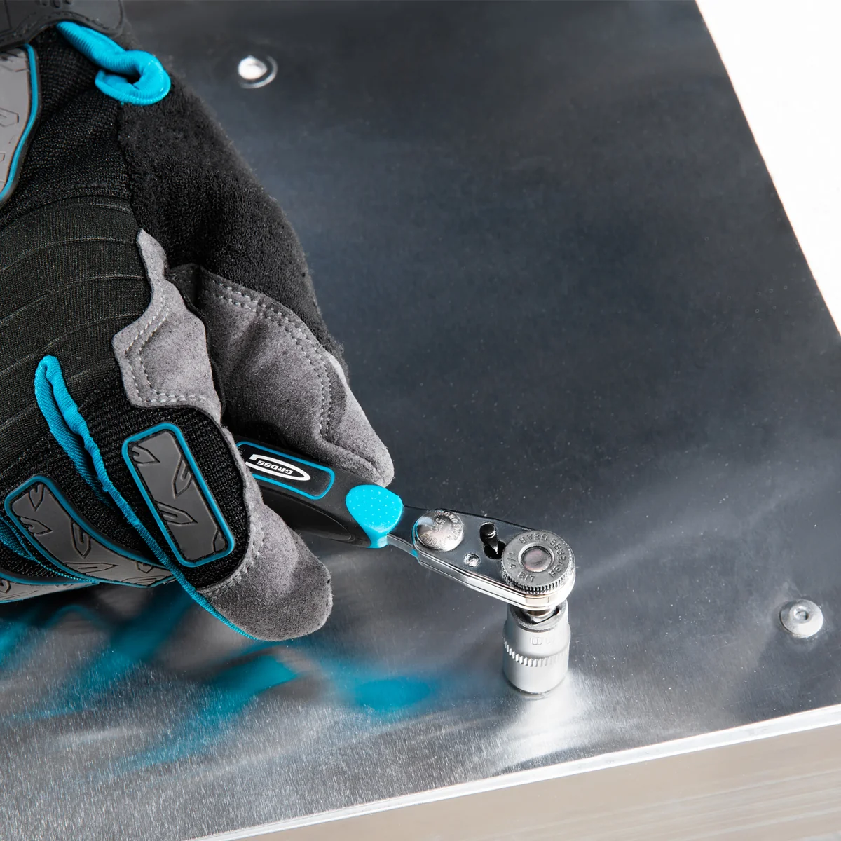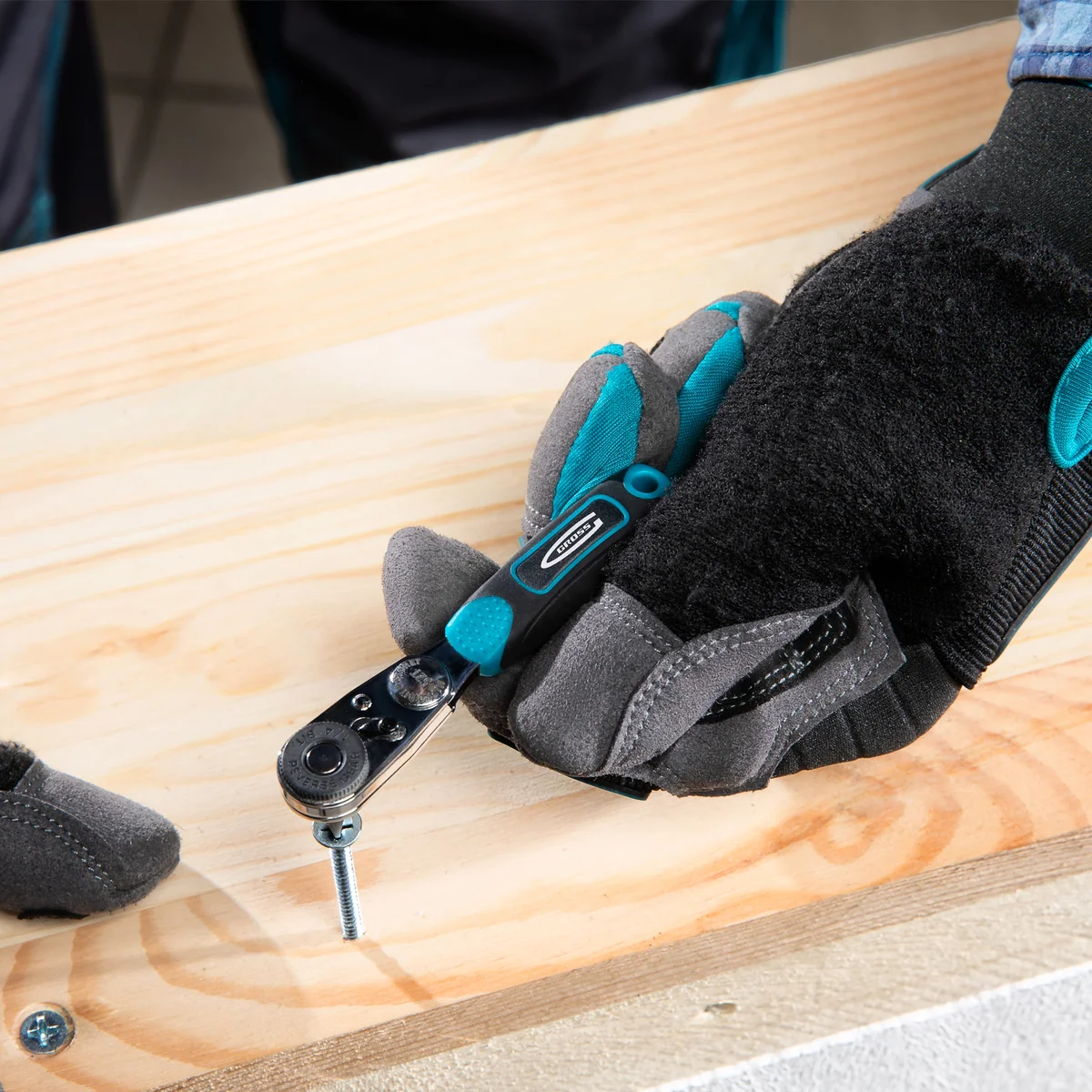 - Комфортная работа — прорезиненный корпус трещотки обеспечивает удобный захват инструмента.
