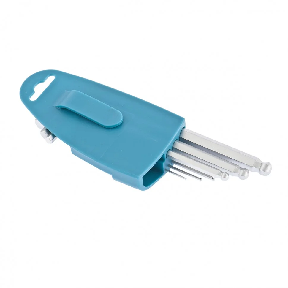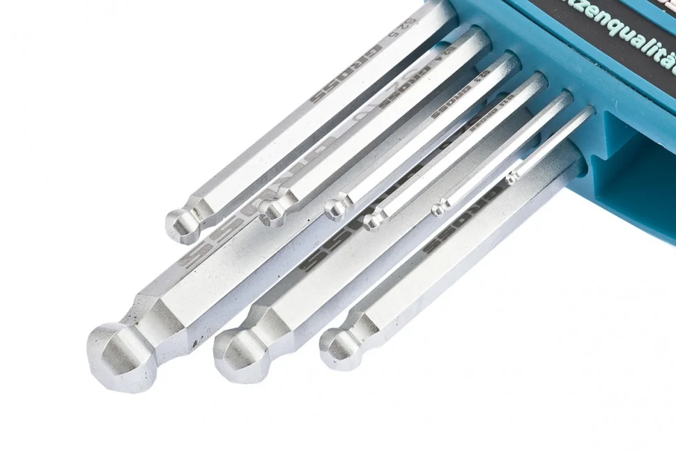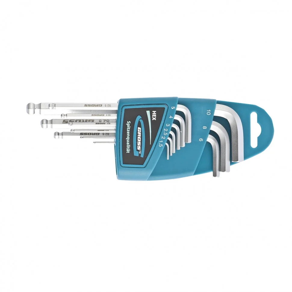Набор удлиненных имбусовых ключей Gross 16403 из стали S2, с шаром и сатинированным покрытием, состоит из 9 предметов для работы с крепежами, оснащенными шлицами HEX 1,5-10 мм. Благодаря своей длине и Г-образной форме ключи позволяют действовать в труднодоступных местах и экономить усилия при монтаже и демонтаже крепежей. Набор пригодится при сборке мебели, для ремонта велосипедов и различного оборудования.ПреимуществаКлючи обладают повышенными прочностными характеристиками, т.к. изготовлены из инструментальной легированной стали S2.Твердость 52-56 HRC обеспечивает устойчивость ключей к износу.Шарообразный наконечник позволяет работать под углом, что особенно актуально в ограниченном пространстве.Сатинированное покрытие предохраняет изделия от механических повреждений и ржавчины.Лазерная маркировка размеров и торговой марки упрощает подбор инструментов и не стирается со временем.Удобный пластиковый чехол с клипсой облегчает хранение набора и позволяет носить его на поясе.