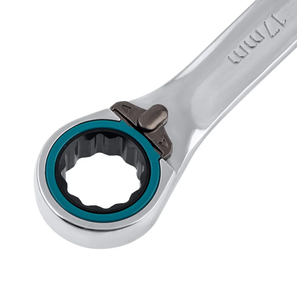 Набор комбинированных реверсивных ключей с трещоткой Gross 14892 используется для монтажа и демонтажа болтов и гаек и включает 7 инструментов размером от 8 до 19 мм, выполненных из стали CrV. Каждый из них имеет две рабочие головки — рожковую и накидную, что расширяет возможности применения. У накидной головки 12-гранный профиль, благодаря чему она надежно захватывает крепеж. Наличие реверса упрощает работу с резьбовыми соединениями. Набор подходит как для профессионального, так и для самостоятельного ремонта автомобилей.ПреимуществаПрочность и повышенная твердость — ключи изготовлены из высококачественной стали хромованадиевой группы.Долговечность — хромоникелевое покрытие предохраняет инструменты от коррозии.Высокий ресурс — твердость материала трещотки составляет 43-47 HRC, поэтому она устойчива к интенсивным нагрузкам.Удобная работа даже в труднодоступных местах — храповый механизм с 72 зубцами обеспечивает плавную и быструю работу с резьбовыми соединениями (угол отклонения трещотки составляет всего 5 градусов).