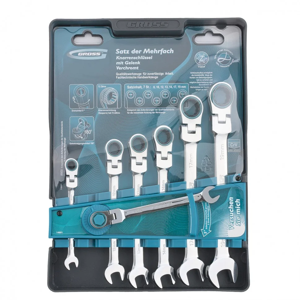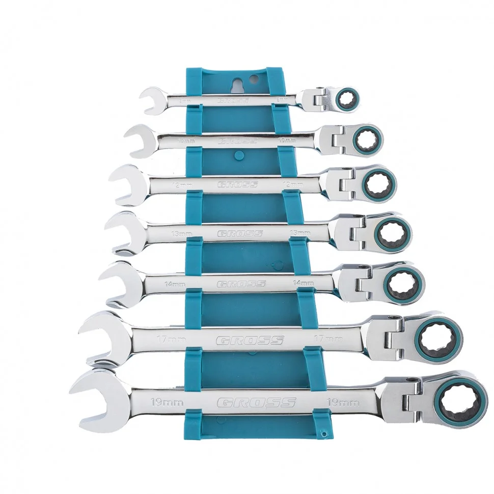 Набор ключей комбинированных с трещоткой, 8-19 мм, 7 шт, шарнирные, CrV Gross 14891